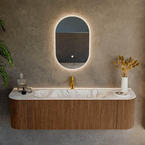 Het ultieme badmeubel dat je badkamer transformeert tot een oase van verfijning. Met zijn halfronde, verticale stroken van massief eiken, verkrijgbaar in de kleuren Oak en Walnut, straalt KURVE vakmanschap uit in elk detail. De zachte rondingen en slim ontworpen deurtjes, elk 40cm hoog, nodigen uit tot gebruik, terwijl de ruimte binnenin optimaal benut wordt dankzij de royale lade van dezelfde hoogte.