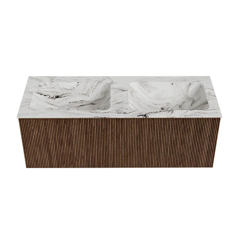 MONDIAZ KURVE-DLUX 120cm badmeubel kleur Walnut met 1 lade. Wastafel LEAF dubbel zonder kraangat kleur Glace.
