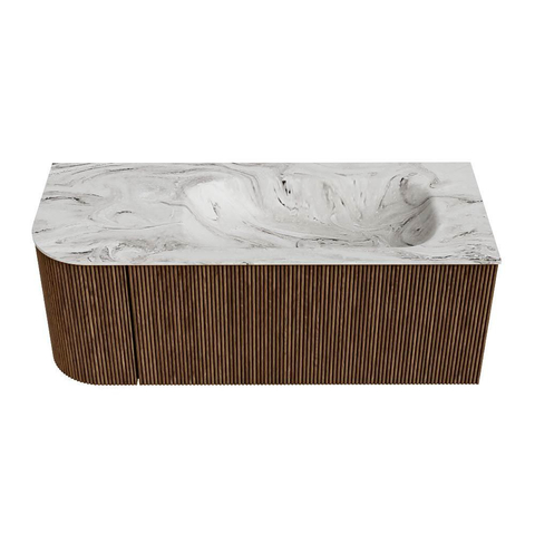 Het ultieme badmeubel dat je badkamer transformeert tot een oase van verfijning. Met zijn halfronde, verticale stroken van massief eiken, verkrijgbaar in de kleuren Oak en Walnut, straalt KURVE vakmanschap uit in elk detail. De zachte rondingen en slim ontworpen deurtjes, elk 40cm hoog, nodigen uit tot gebruik, terwijl de ruimte binnenin optimaal benut wordt dankzij de royale lade van dezelfde hoogte.