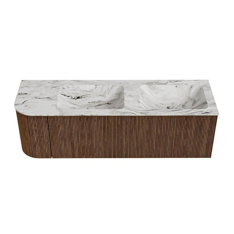 MONDIAZ KURVE-DLUX 145cm badmeubel met module 25 L kleur Walnut met 1 lade en 1 deur. Wastafel LEAF dubbel / rechts zonder kraangat kleur Glace.