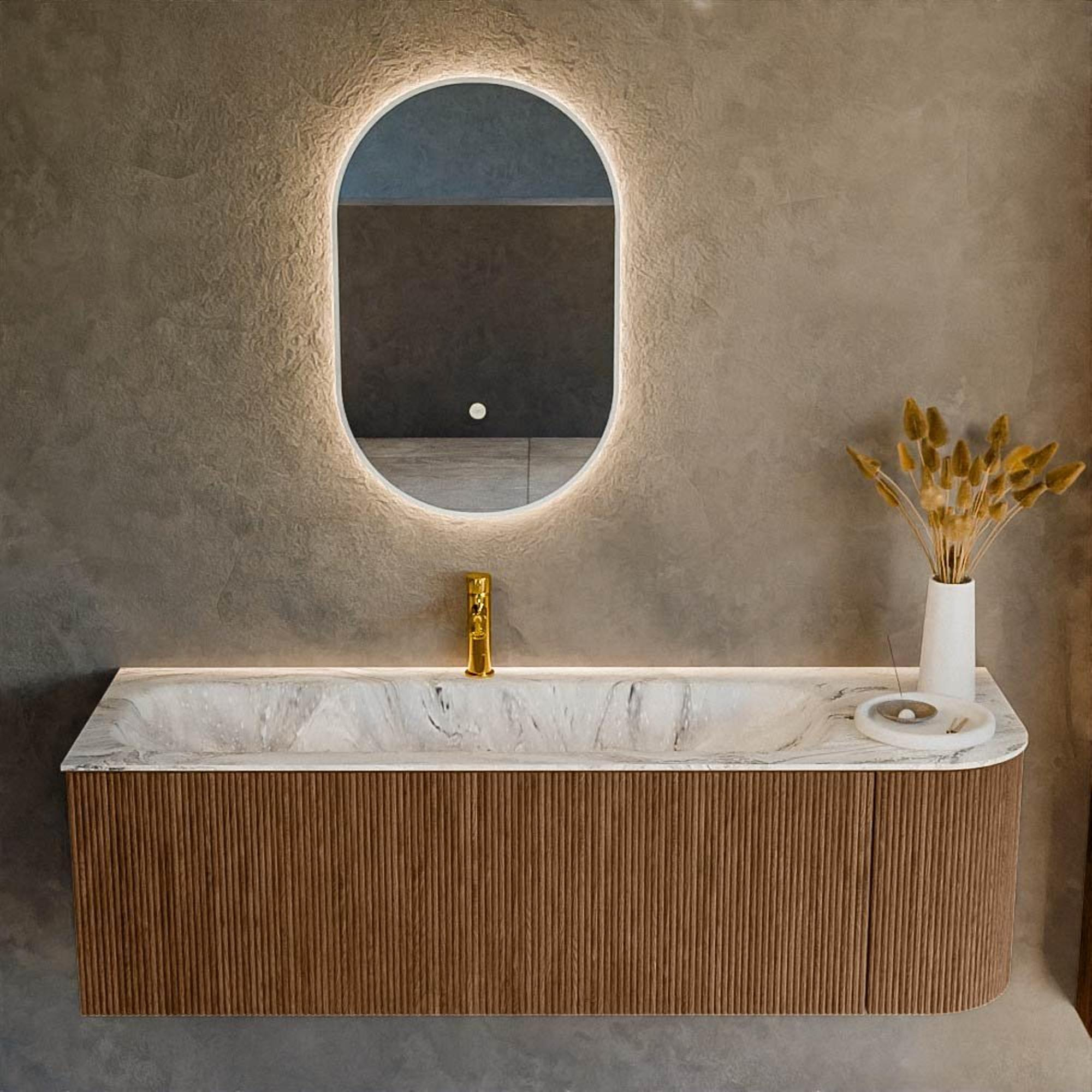 Het ultieme badmeubel dat je badkamer transformeert tot een oase van verfijning. Met zijn halfronde, verticale stroken van massief eiken, verkrijgbaar in de kleuren Oak en Walnut, straalt KURVE vakmanschap uit in elk detail. De zachte rondingen en slim ontworpen deurtjes, elk 40cm hoog, nodigen uit tot gebruik, terwijl de ruimte binnenin optimaal benut wordt dankzij de royale lade van dezelfde hoogte.