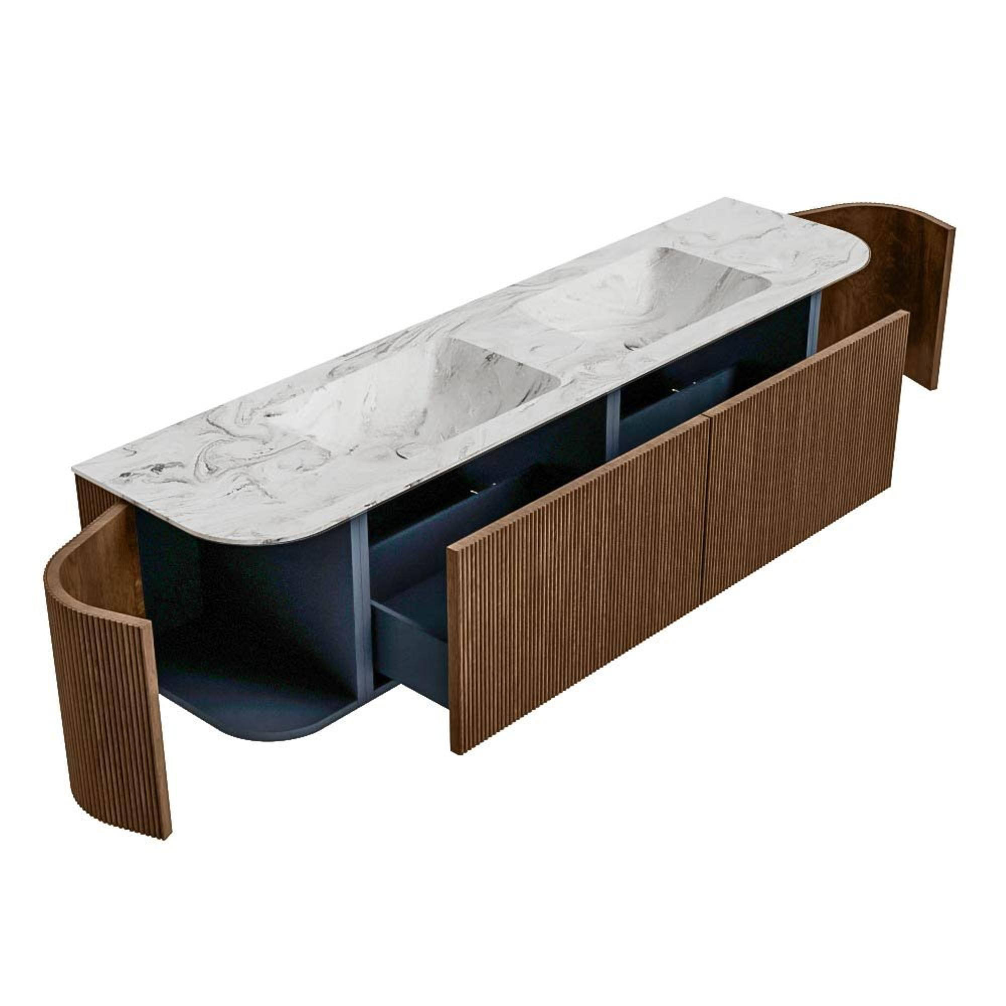 Het ultieme badmeubel dat je badkamer transformeert tot een oase van verfijning. Met zijn halfronde, verticale stroken van massief eiken, verkrijgbaar in de kleuren Oak en Walnut, straalt KURVE vakmanschap uit in elk detail. De zachte rondingen en slim ontworpen deurtjes, elk 40cm hoog, nodigen uit tot gebruik, terwijl de ruimte binnenin optimaal benut wordt dankzij de royale lade van dezelfde hoogte.