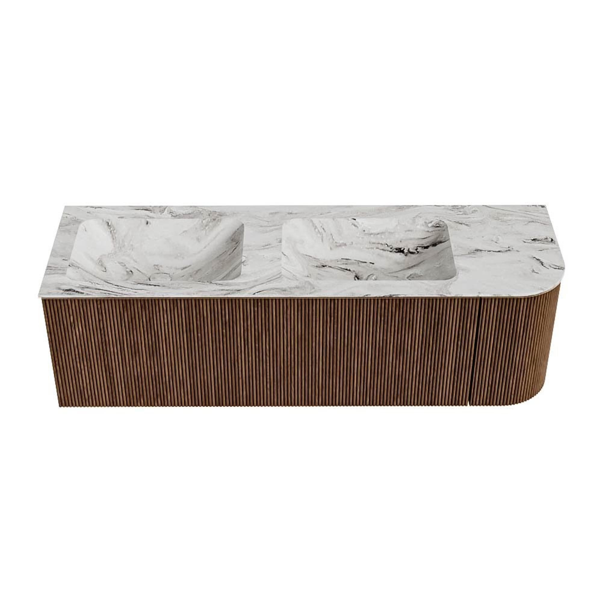 MONDIAZ KURVE-DLUX 145cm badmeubel met module 25 R kleur Walnut met 1 lade en 1 deur. Wastafel LEAF dubbel / links zonder kraangat kleur Glace.