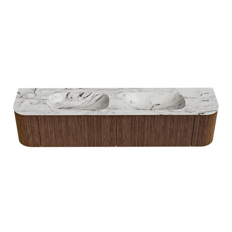 Het ultieme badmeubel dat je badkamer transformeert tot een oase van verfijning. Met zijn halfronde, verticale stroken van massief eiken, verkrijgbaar in de kleuren Oak en Walnut, straalt KURVE vakmanschap uit in elk detail. De zachte rondingen en slim ontworpen deurtjes, elk 40cm hoog, nodigen uit tot gebruik, terwijl de ruimte binnenin optimaal benut wordt dankzij de royale lade van dezelfde hoogte.