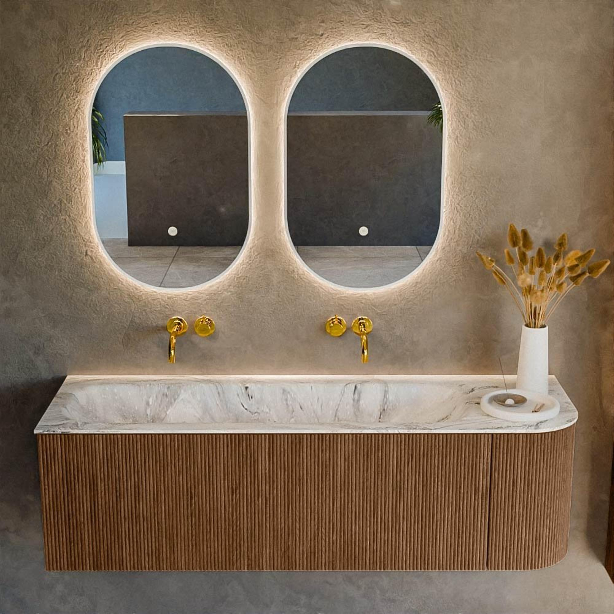 Het ultieme badmeubel dat je badkamer transformeert tot een oase van verfijning. Met zijn halfronde, verticale stroken van massief eiken, verkrijgbaar in de kleuren Oak en Walnut, straalt KURVE vakmanschap uit in elk detail. De zachte rondingen en slim ontworpen deurtjes, elk 40cm hoog, nodigen uit tot gebruik, terwijl de ruimte binnenin optimaal benut wordt dankzij de royale lade van dezelfde hoogte.
