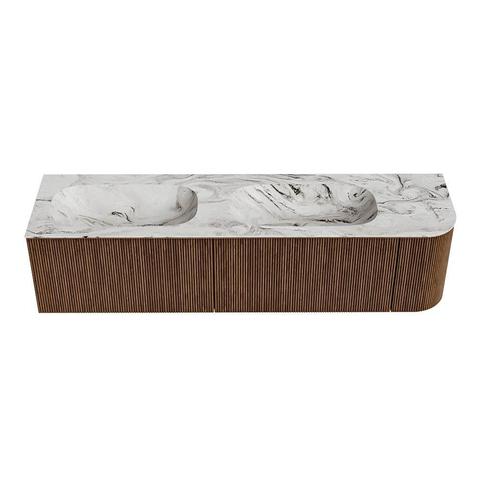 MONDIAZ KURVE-DLUX 175cm badmeubel met module 25 R kleur Walnut met 2 lades en 1 deur. Wastafel STOR SMALL dubbel / links zonder kraangat kleur Glace.