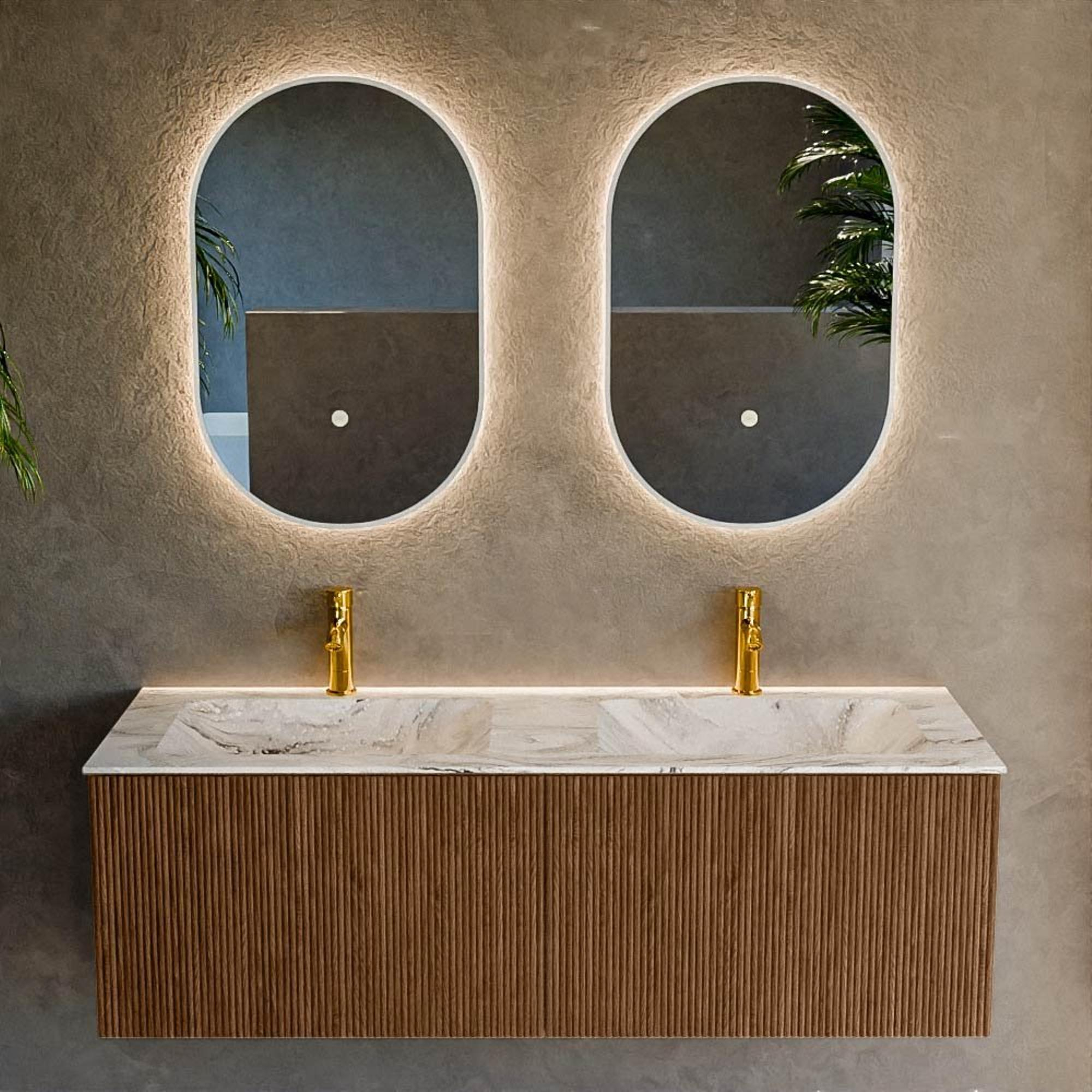 MONDIAZ KURVE-DLUX 130cm badmeubel kleur Walnut met 2 lades. Wastafel LEAF dubbel 2 kraangaten kleur Glace.