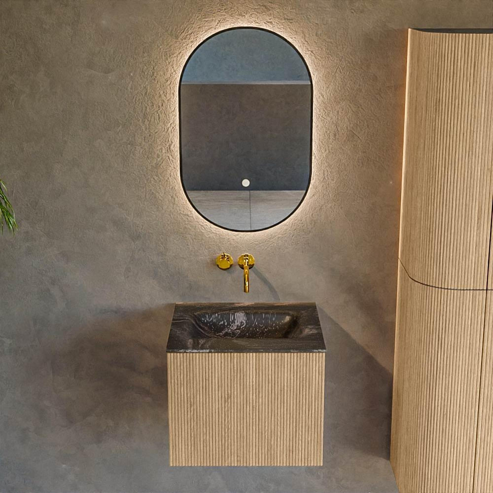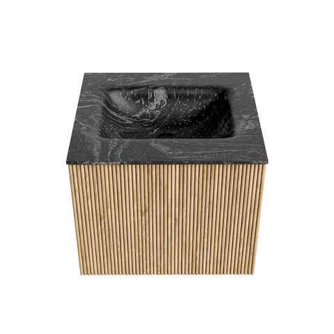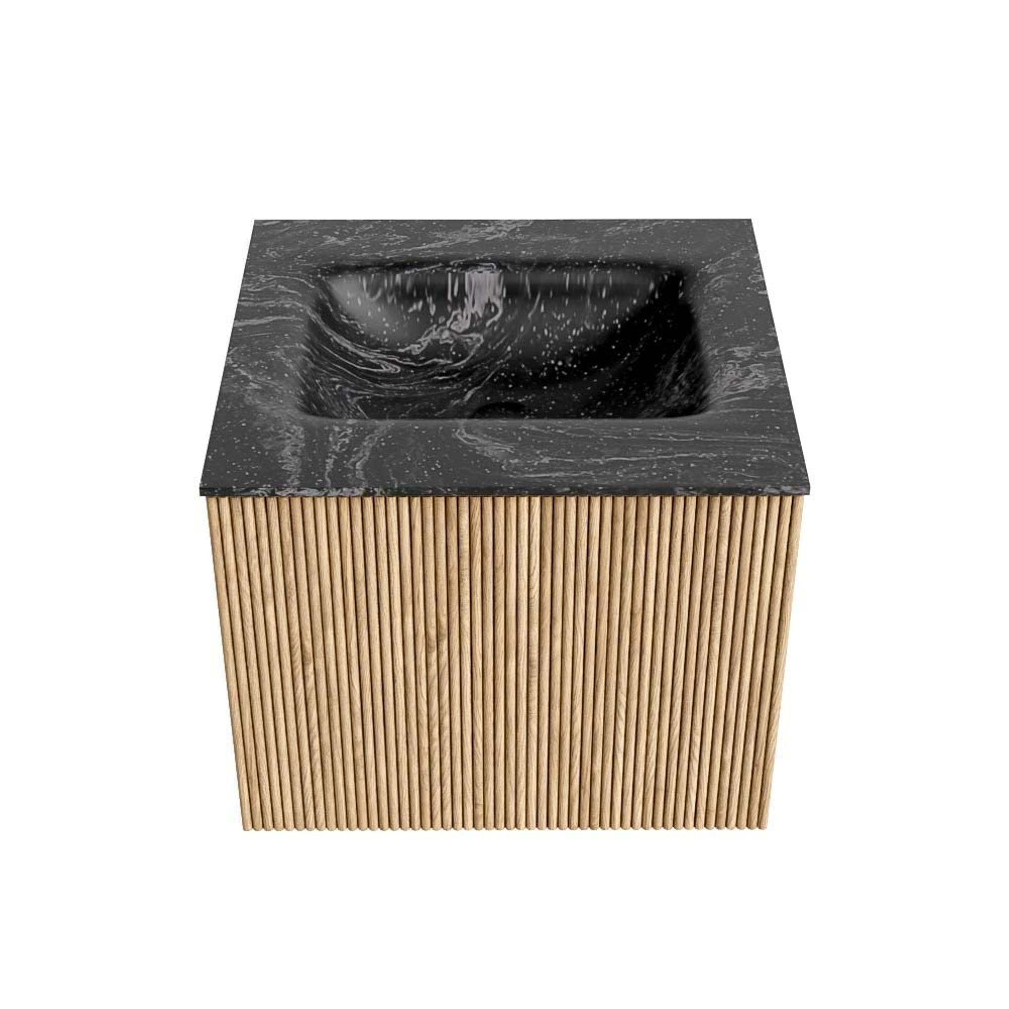 MONDIAZ KURVE-DLUX 50cm badmeubel kleur Oak met 1 lade. Wastafel GRUNNE midden zonder kraangat kleur Lava.