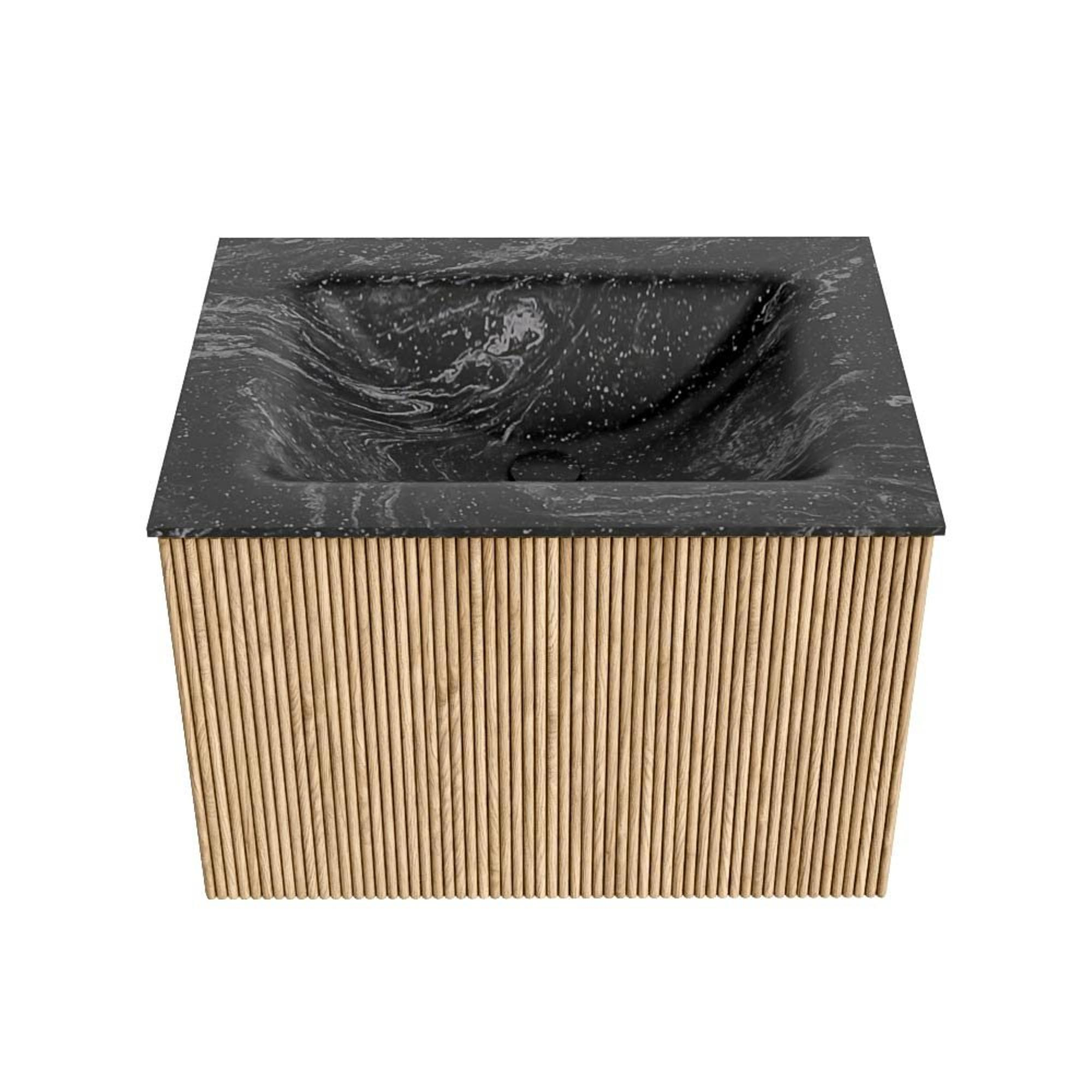 MONDIAZ KURVE-DLUX 60cm badmeubel kleur Oak met 1 lade. Wastafel CLOUD midden zonder kraangat kleur Lava.