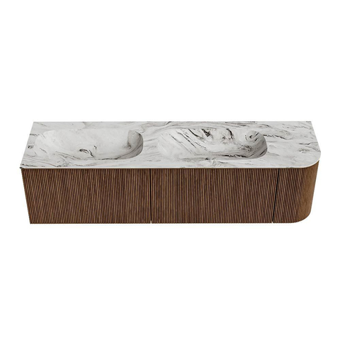 MONDIAZ KURVE-DLUX 165cm badmeubel met module 25 R kleur Walnut met 2 lades en 1 deur. Wastafel STOR SMALL dubbel / links zonder kraangat kleur Glace.