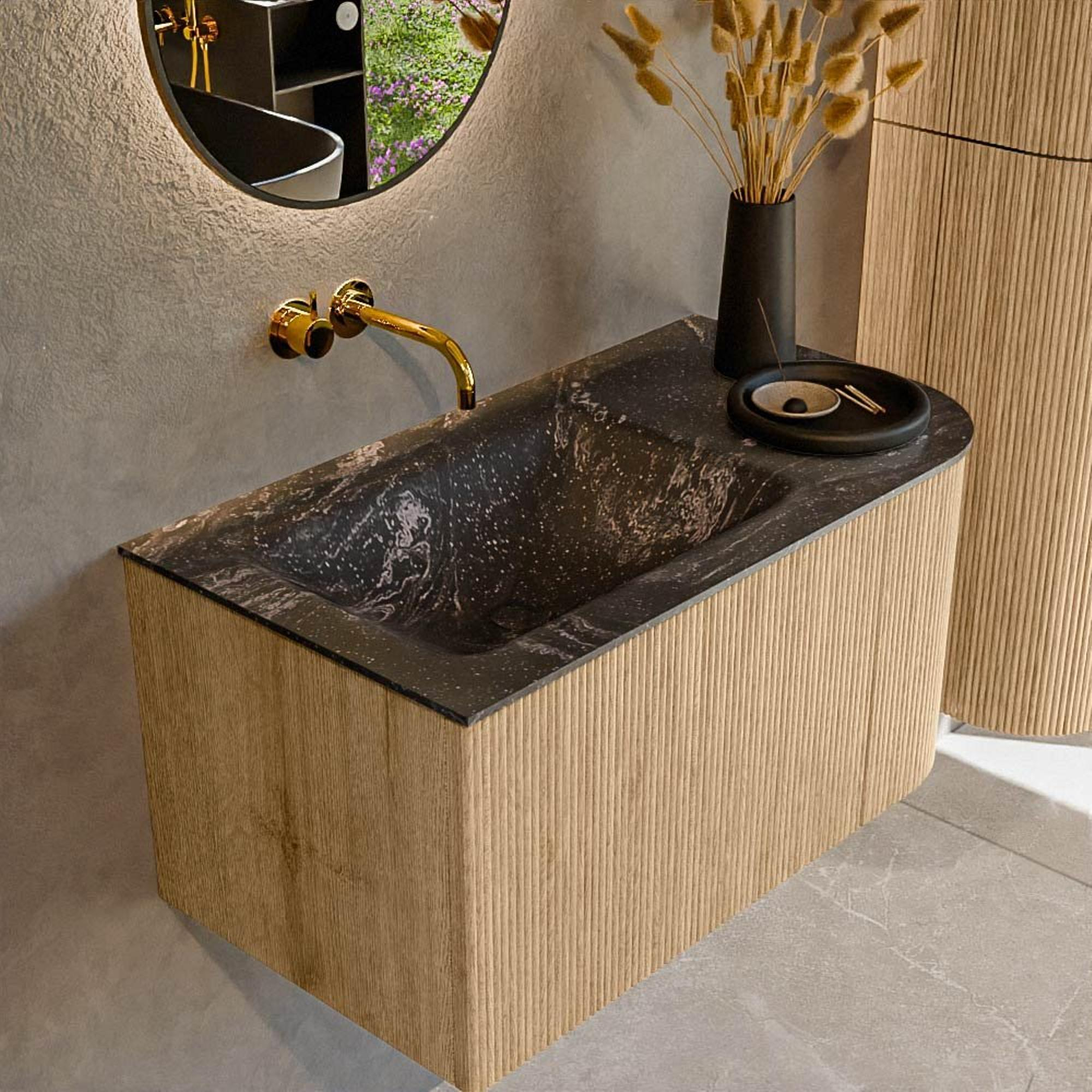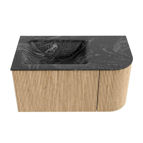 MONDIAZ KURVE-DLUX 85cm badmeubel met module 25 R kleur Oak met 1 lade en 1 deur. Wastafel CLOUD links zonder kraangat kleur Lava.