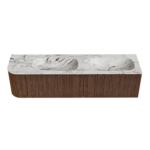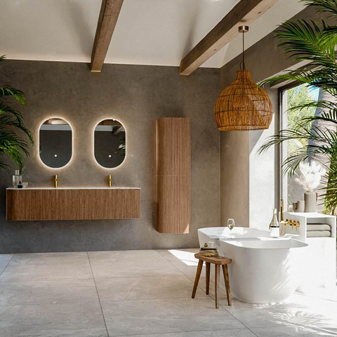 Het ultieme badmeubel dat je badkamer transformeert tot een oase van verfijning. Met zijn halfronde, verticale stroken van massief eiken, verkrijgbaar in de kleuren Oak en Walnut, straalt KURVE vakmanschap uit in elk detail. De zachte rondingen en slim ontworpen deurtjes, elk 40cm hoog, nodigen uit tot gebruik, terwijl de ruimte binnenin optimaal benut wordt dankzij de royale lade van dezelfde hoogte.