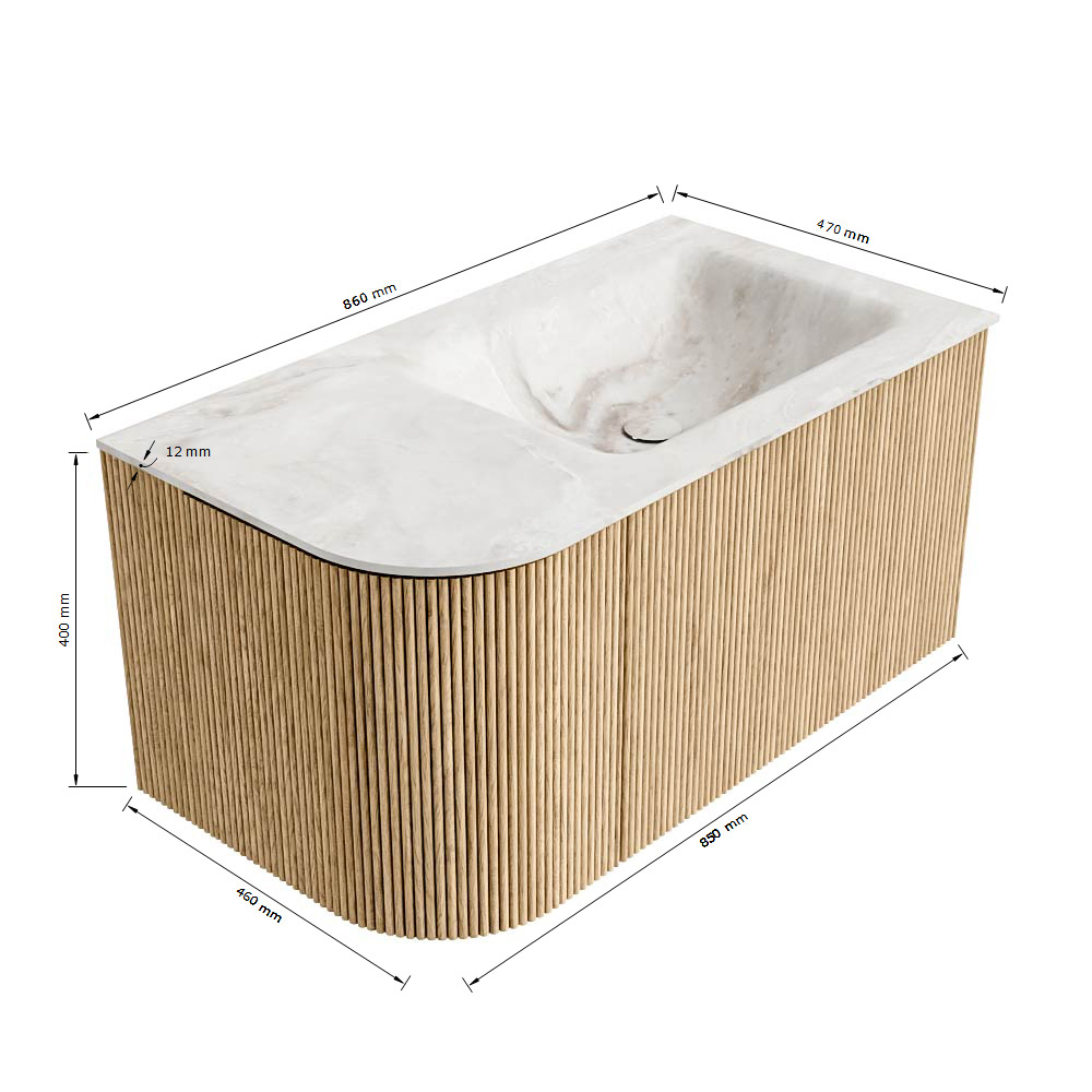 Het ultieme badmeubel dat je badkamer transformeert tot een oase van verfijning. Met zijn halfronde, verticale stroken van massief eiken, verkrijgbaar in de kleuren Oak en Walnut, straalt KURVE vakmanschap uit in elk detail. De zachte rondingen en slim ontworpen deurtjes, elk 40cm hoog, nodigen uit tot gebruik, terwijl de ruimte binnenin optimaal benut wordt dankzij de royale lade van dezelfde hoogte.