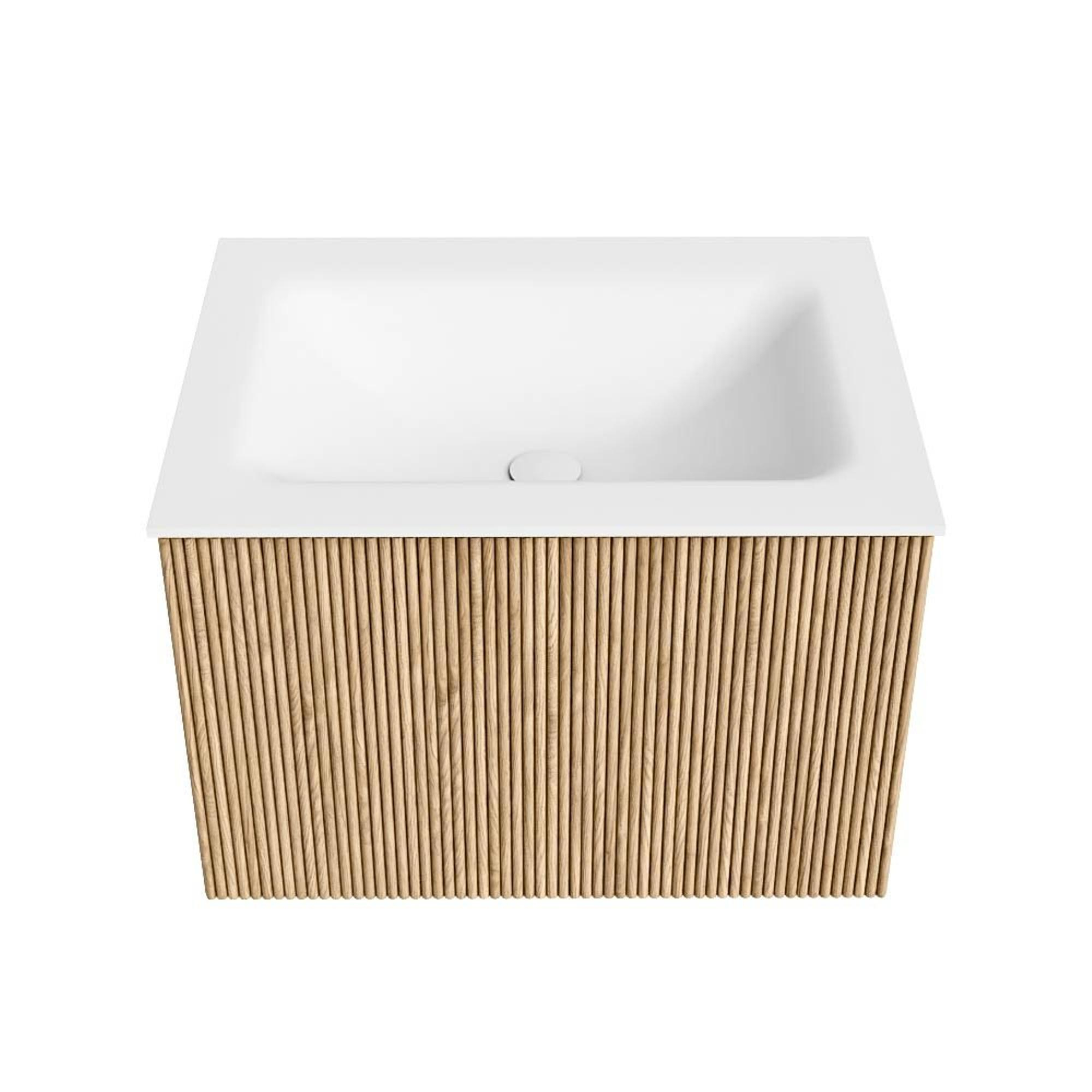 MONDIAZ KURVE 60cm badmeubel kleur Oak met 1 lade. Wastafel CLOUD midden zonder kraangat Talc.
