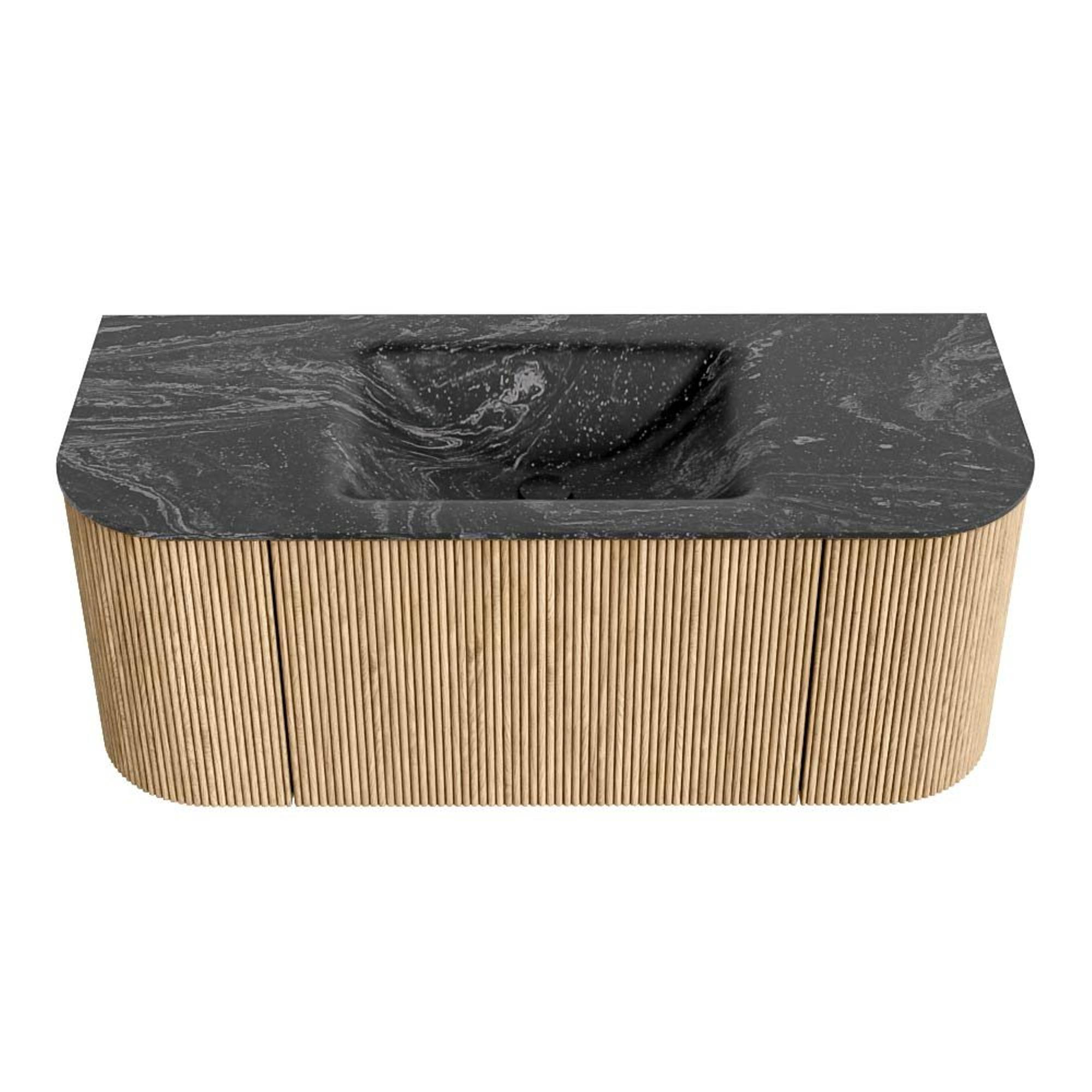 MONDIAZ KURVE-DLUX 110cm badmeubel met module 25 Len R kleur Oak met 1 lade en 2 deuren. Wastafel CLOUD midden zonder kraangat kleur Lava.