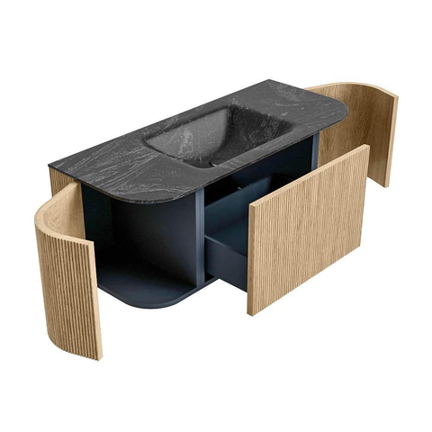 Het ultieme badmeubel dat je badkamer transformeert tot een oase van verfijning. Met zijn halfronde, verticale stroken van massief eiken, verkrijgbaar in de kleuren Oak en Walnut, straalt KURVE vakmanschap uit in elk detail. De zachte rondingen en slim ontworpen deurtjes, elk 40cm hoog, nodigen uit tot gebruik, terwijl de ruimte binnenin optimaal benut wordt dankzij de royale lade van dezelfde hoogte.
