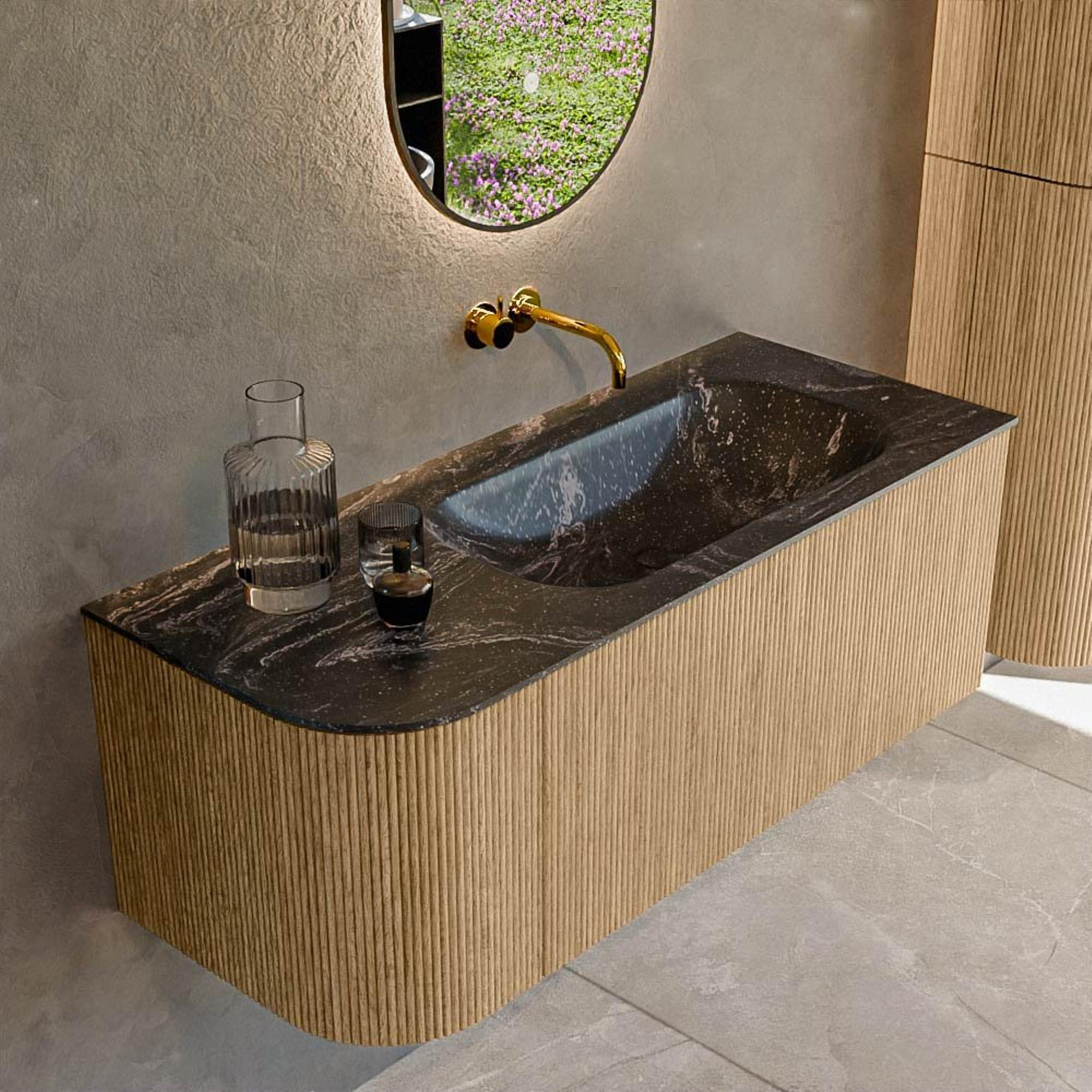 Het ultieme badmeubel dat je badkamer transformeert tot een oase van verfijning. Met zijn halfronde, verticale stroken van massief eiken, verkrijgbaar in de kleuren Oak en Walnut, straalt KURVE vakmanschap uit in elk detail. De zachte rondingen en slim ontworpen deurtjes, elk 40cm hoog, nodigen uit tot gebruik, terwijl de ruimte binnenin optimaal benut wordt dankzij de royale lade van dezelfde hoogte.