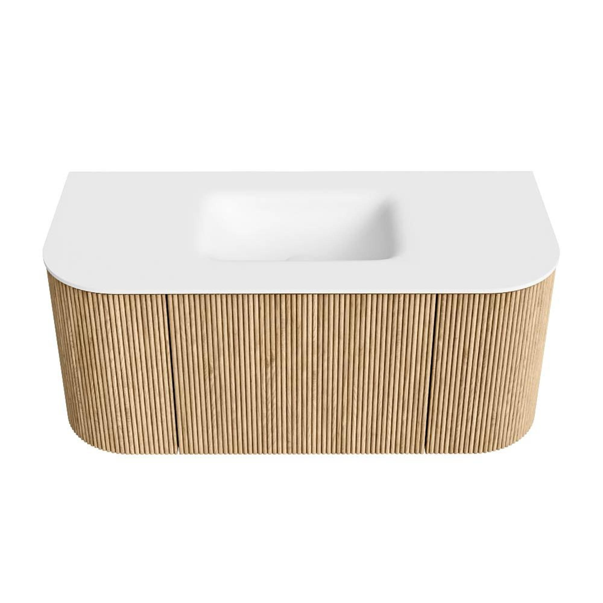 MONDIAZ KURVE 100cm badmeubel met module 25 Len R kleur Oak met 1 lade en 2 deuren. Wastafel GRUNNE midden 1 kraangat Talc.