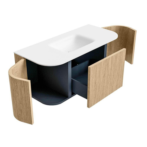 Het ultieme badmeubel dat je badkamer transformeert tot een oase van verfijning. Met zijn halfronde, verticale stroken van massief eiken, verkrijgbaar in de kleuren Oak en Walnut, straalt KURVE vakmanschap uit in elk detail. De zachte rondingen en slim ontworpen deurtjes, elk 40cm hoog, nodigen uit tot gebruik, terwijl de ruimte binnenin optimaal benut wordt dankzij de royale lade van dezelfde hoogte.