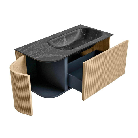 Het ultieme badmeubel dat je badkamer transformeert tot een oase van verfijning. Met zijn halfronde, verticale stroken van massief eiken, verkrijgbaar in de kleuren Oak en Walnut, straalt KURVE vakmanschap uit in elk detail. De zachte rondingen en slim ontworpen deurtjes, elk 40cm hoog, nodigen uit tot gebruik, terwijl de ruimte binnenin optimaal benut wordt dankzij de royale lade van dezelfde hoogte.