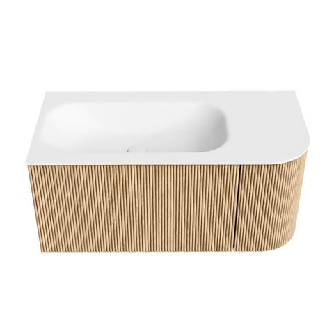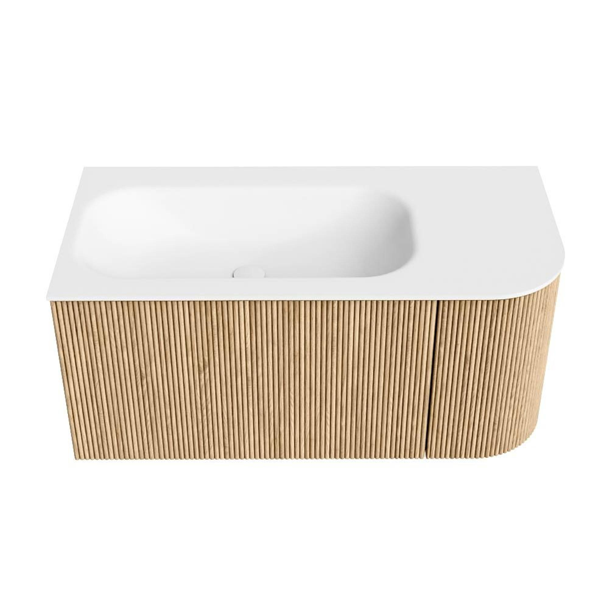 MONDIAZ KURVE 95cm badmeubel met module 25 R kleur Oak met 1 lade en 1 deur. Wastafel BIG SMALL links 1 kraangat Talc.