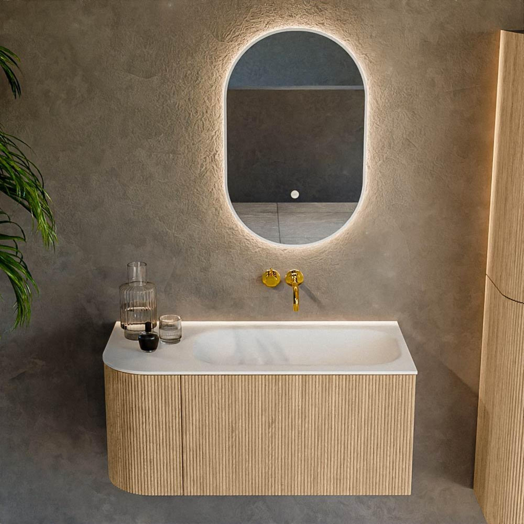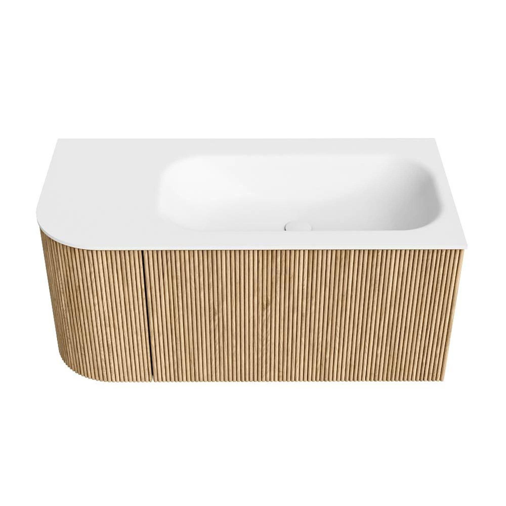 MONDIAZ KURVE 95cm badmeubel met module 25 L kleur Oak met 1 lade en 1 deur. Wastafel BIG SMALL rechts zonder kraangat Talc.
