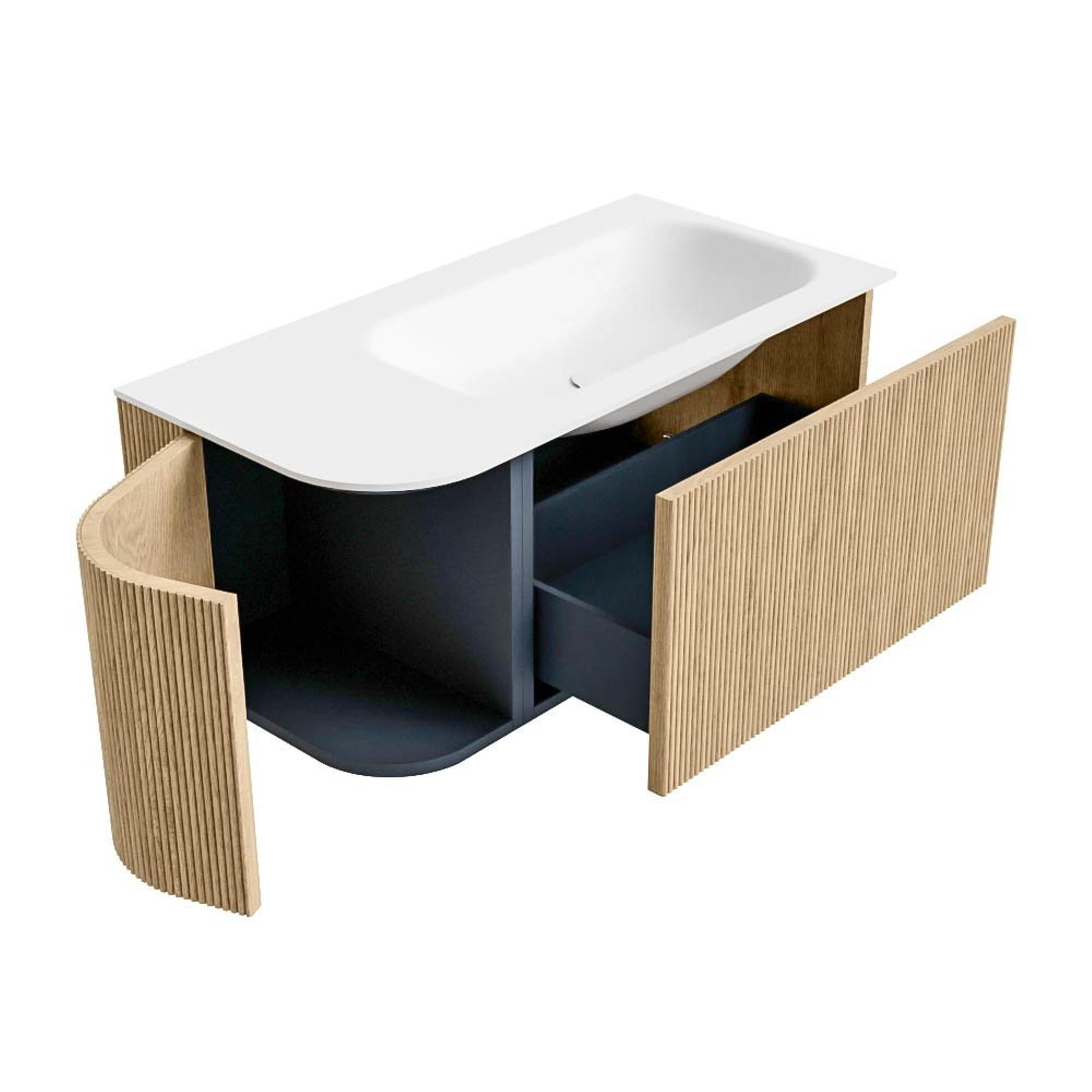 Het ultieme badmeubel dat je badkamer transformeert tot een oase van verfijning. Met zijn halfronde, verticale stroken van massief eiken, verkrijgbaar in de kleuren Oak en Walnut, straalt KURVE vakmanschap uit in elk detail. De zachte rondingen en slim ontworpen deurtjes, elk 40cm hoog, nodigen uit tot gebruik, terwijl de ruimte binnenin optimaal benut wordt dankzij de royale lade van dezelfde hoogte.