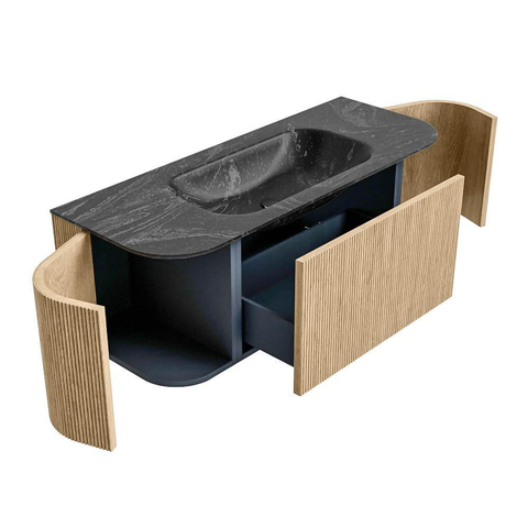 Het ultieme badmeubel dat je badkamer transformeert tot een oase van verfijning. Met zijn halfronde, verticale stroken van massief eiken, verkrijgbaar in de kleuren Oak en Walnut, straalt KURVE vakmanschap uit in elk detail. De zachte rondingen en slim ontworpen deurtjes, elk 40cm hoog, nodigen uit tot gebruik, terwijl de ruimte binnenin optimaal benut wordt dankzij de royale lade van dezelfde hoogte.