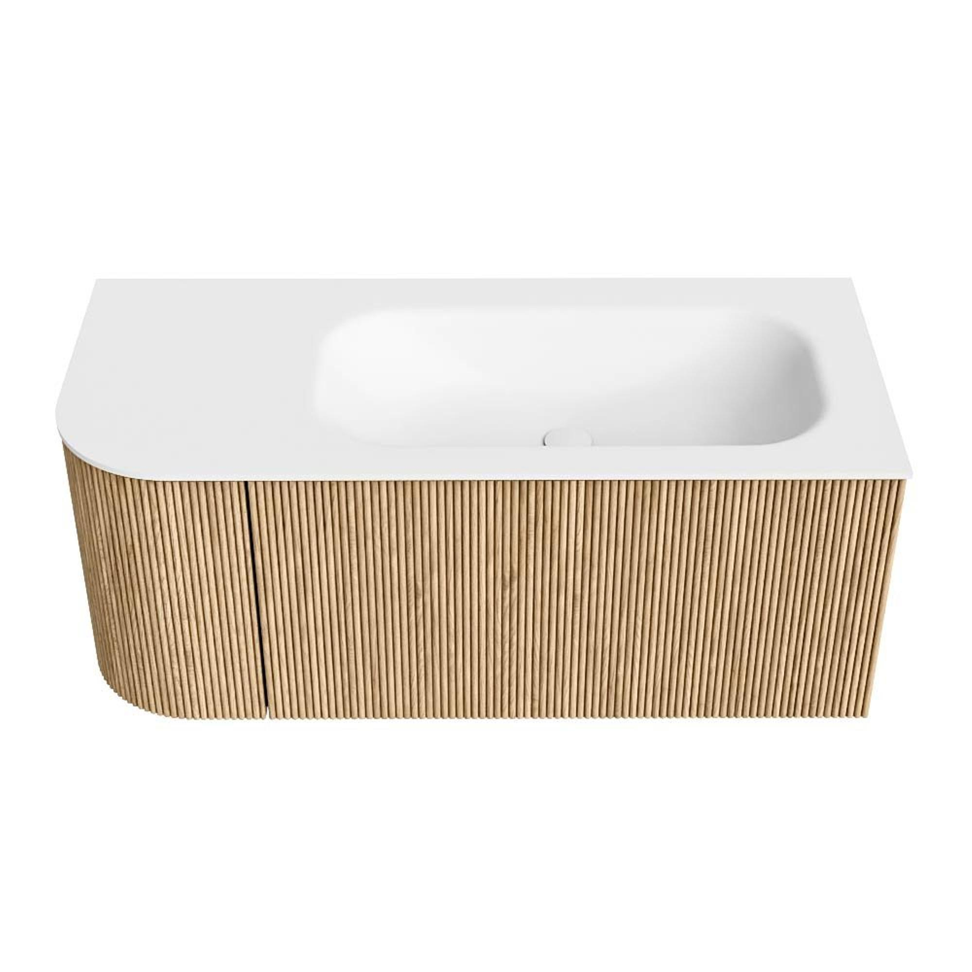 MONDIAZ KURVE 105cm badmeubel met module 25 L kleur Oak met 1 lade en 1 deur. Wastafel BIG SMALL rechts 1 kraangat Talc.
