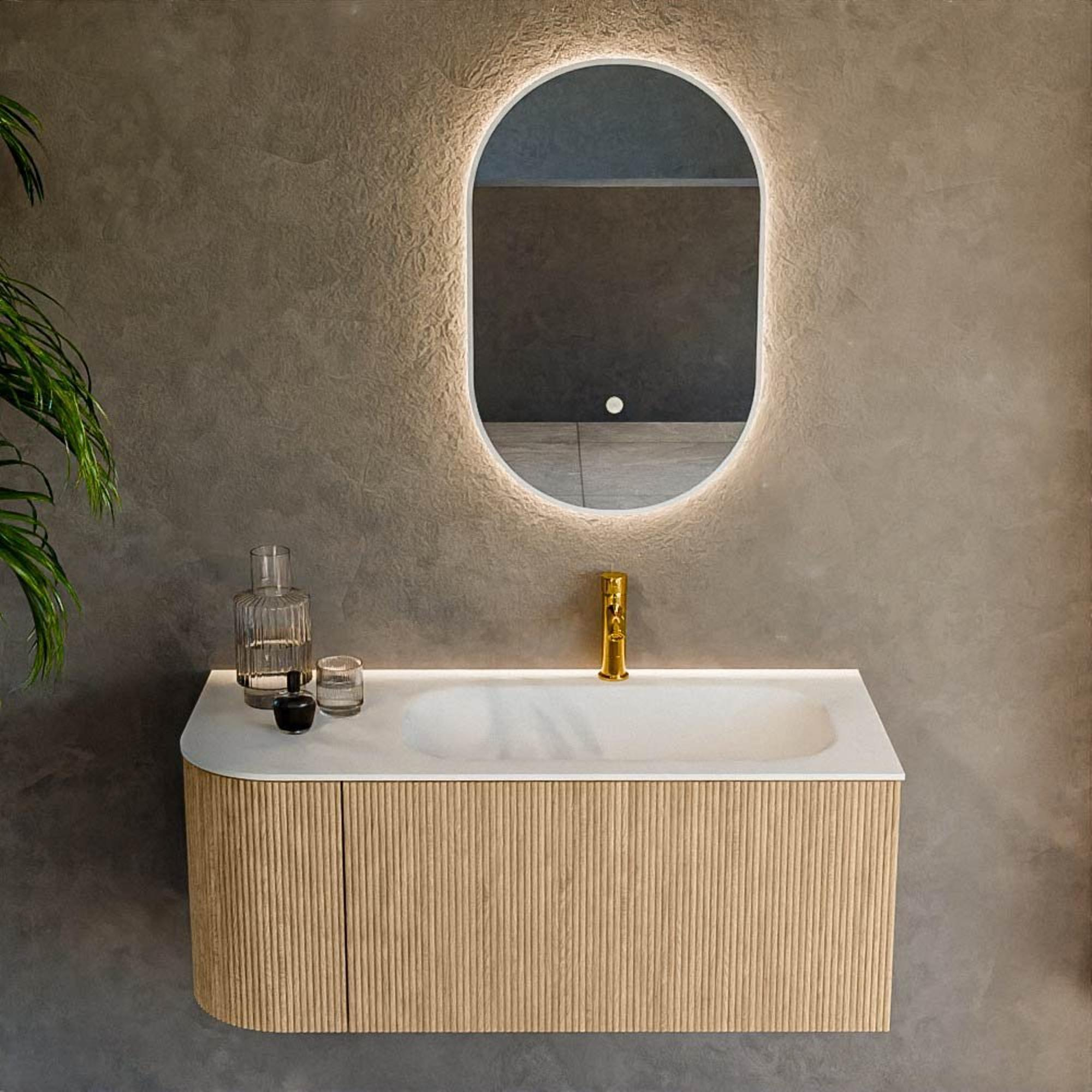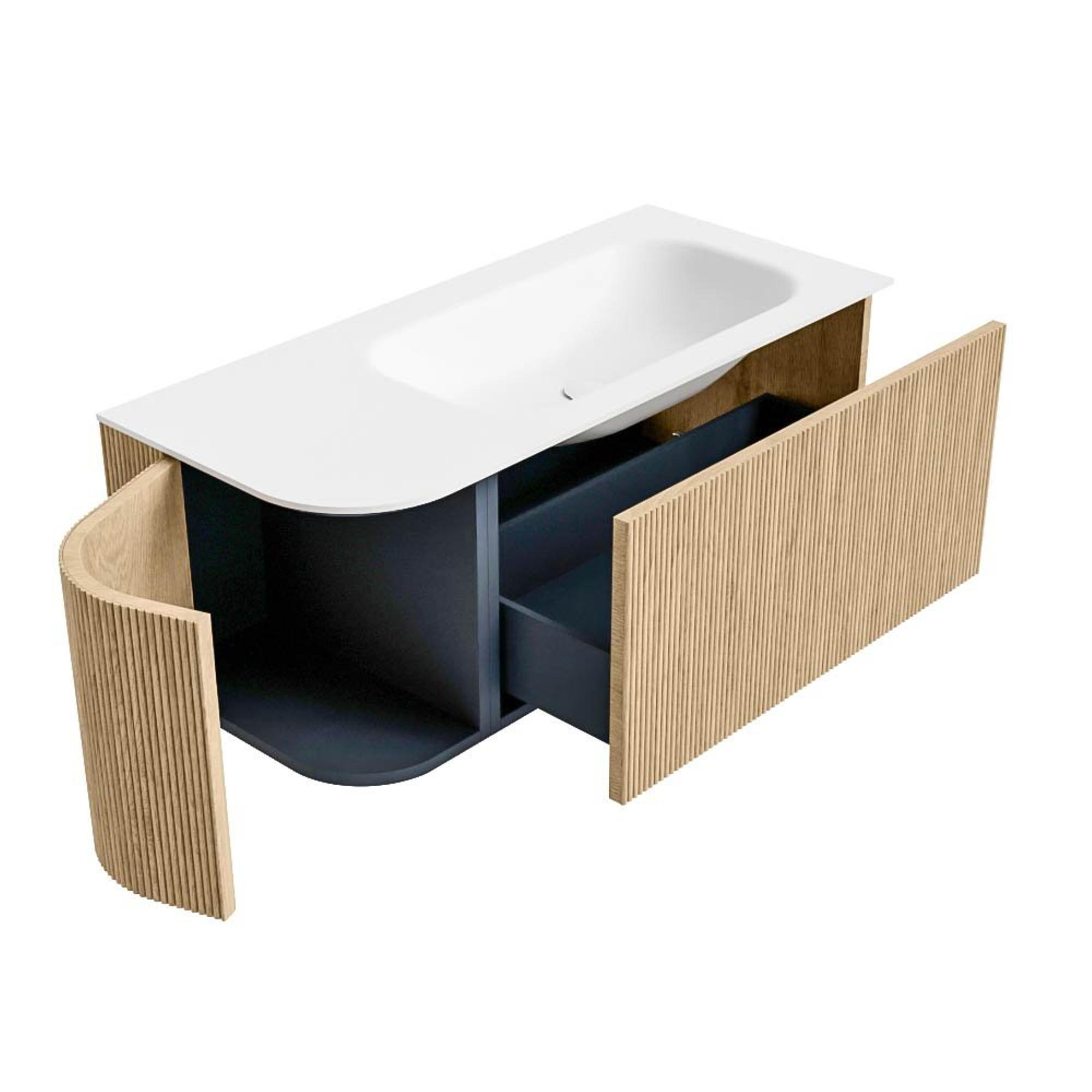 Het ultieme badmeubel dat je badkamer transformeert tot een oase van verfijning. Met zijn halfronde, verticale stroken van massief eiken, verkrijgbaar in de kleuren Oak en Walnut, straalt KURVE vakmanschap uit in elk detail. De zachte rondingen en slim ontworpen deurtjes, elk 40cm hoog, nodigen uit tot gebruik, terwijl de ruimte binnenin optimaal benut wordt dankzij de royale lade van dezelfde hoogte.