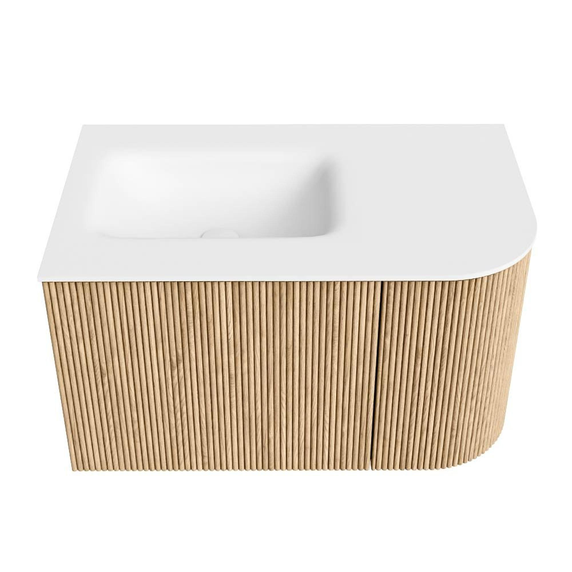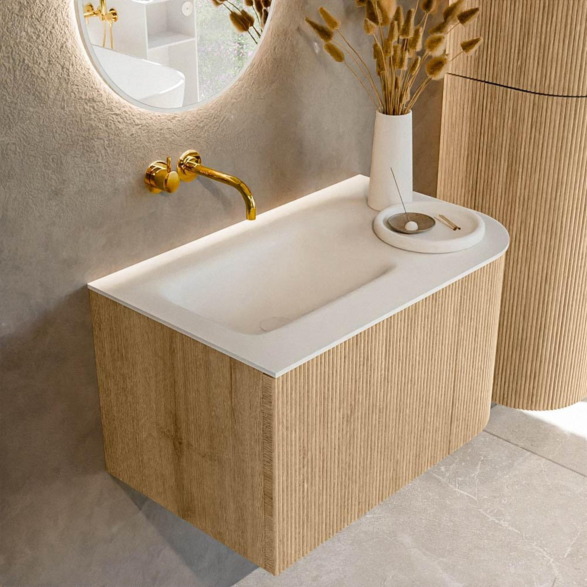 MONDIAZ KURVE 75cm badmeubel met module 25 R kleur Oak met 1 lade en 1 deur. Wastafel GRUNNE links zonder kraangat Talc.