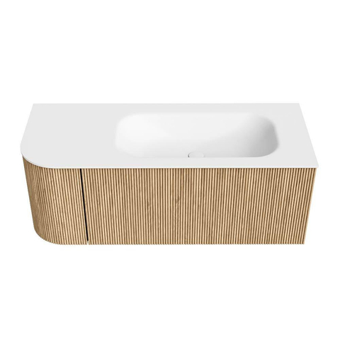 MONDIAZ KURVE 115cm badmeubel met module 25 L kleur Oak met 1 lade en 1 deur. Wastafel BIG SMALL rechts zonder kraangat Talc.