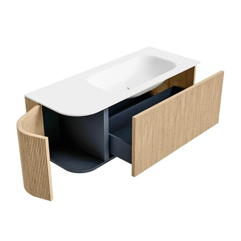 Het ultieme badmeubel dat je badkamer transformeert tot een oase van verfijning. Met zijn halfronde, verticale stroken van massief eiken, verkrijgbaar in de kleuren Oak en Walnut, straalt KURVE vakmanschap uit in elk detail. De zachte rondingen en slim ontworpen deurtjes, elk 40cm hoog, nodigen uit tot gebruik, terwijl de ruimte binnenin optimaal benut wordt dankzij de royale lade van dezelfde hoogte.