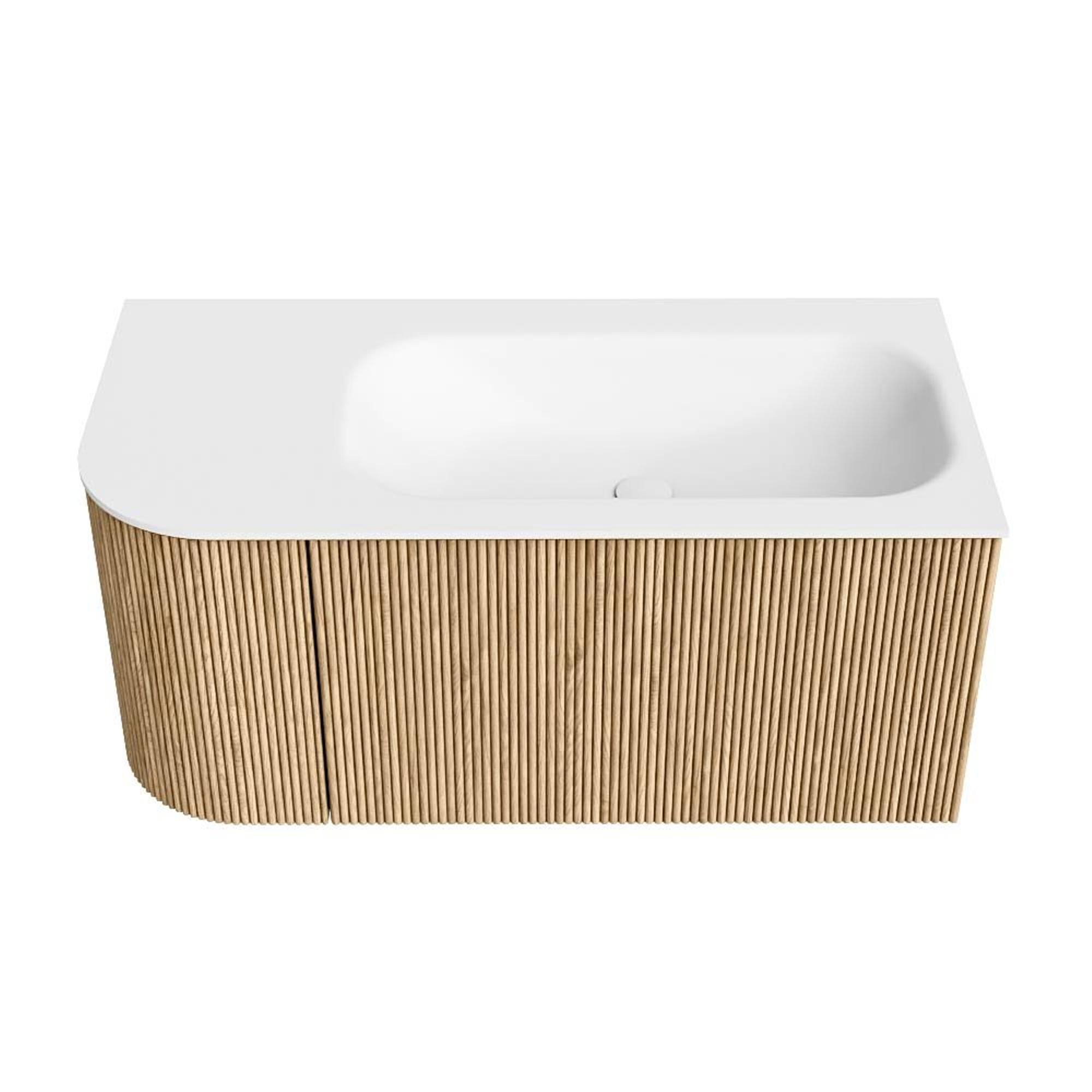 MONDIAZ KURVE 95cm badmeubel met module 25 L kleur Oak met 1 lade en 1 deur. Wastafel BIG SMALL rechts 1 kraangat Talc.