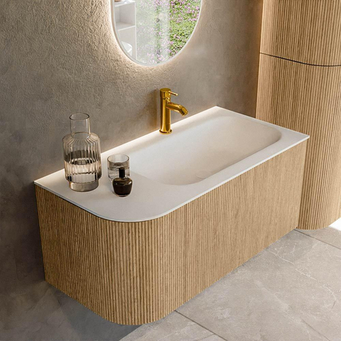 Het ultieme badmeubel dat je badkamer transformeert tot een oase van verfijning. Met zijn halfronde, verticale stroken van massief eiken, verkrijgbaar in de kleuren Oak en Walnut, straalt KURVE vakmanschap uit in elk detail. De zachte rondingen en slim ontworpen deurtjes, elk 40cm hoog, nodigen uit tot gebruik, terwijl de ruimte binnenin optimaal benut wordt dankzij de royale lade van dezelfde hoogte.