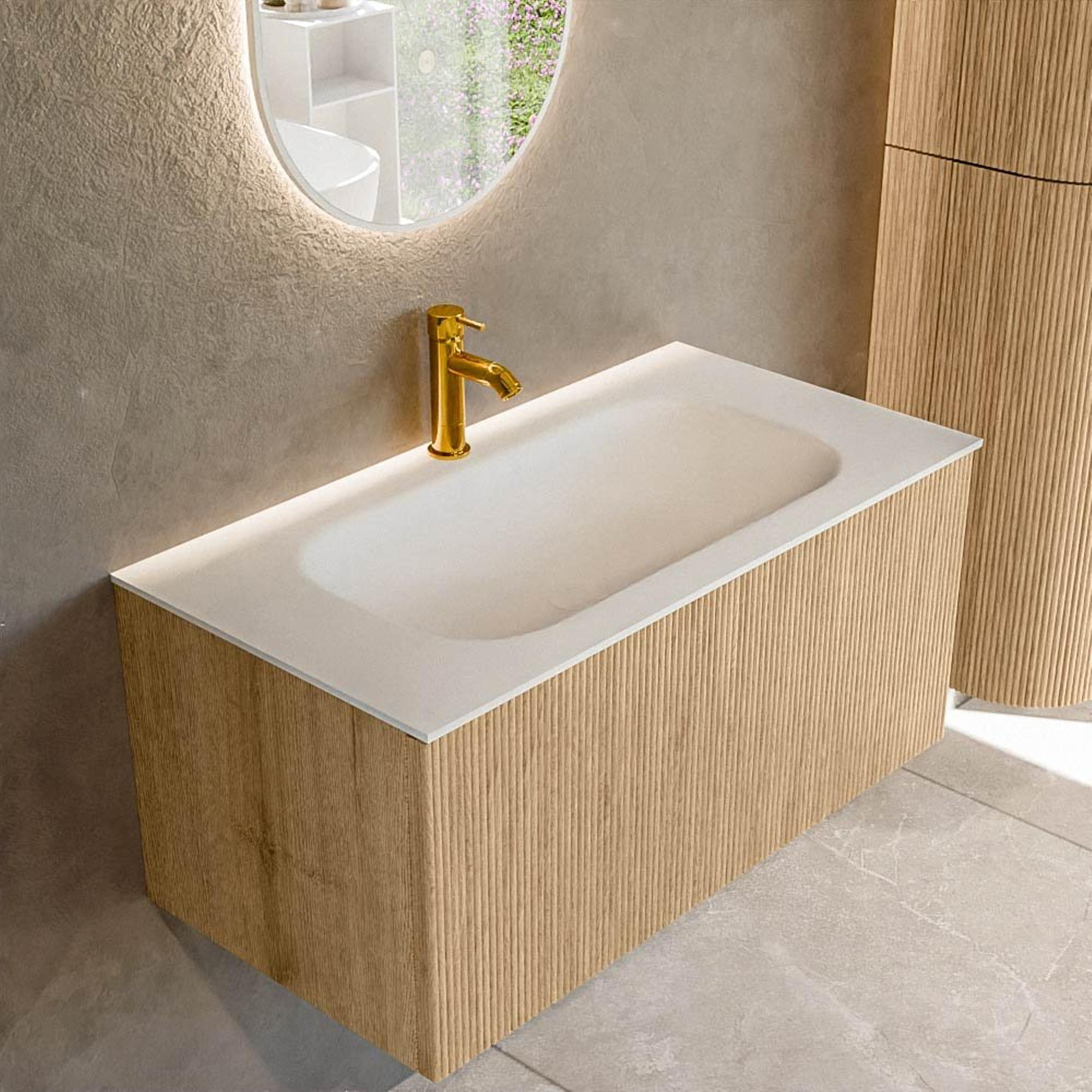 MONDIAZ KURVE 90cm badmeubel kleur Oak met 1 lade. Wastafel BIG SMALL midden 1 kraangat Talc.