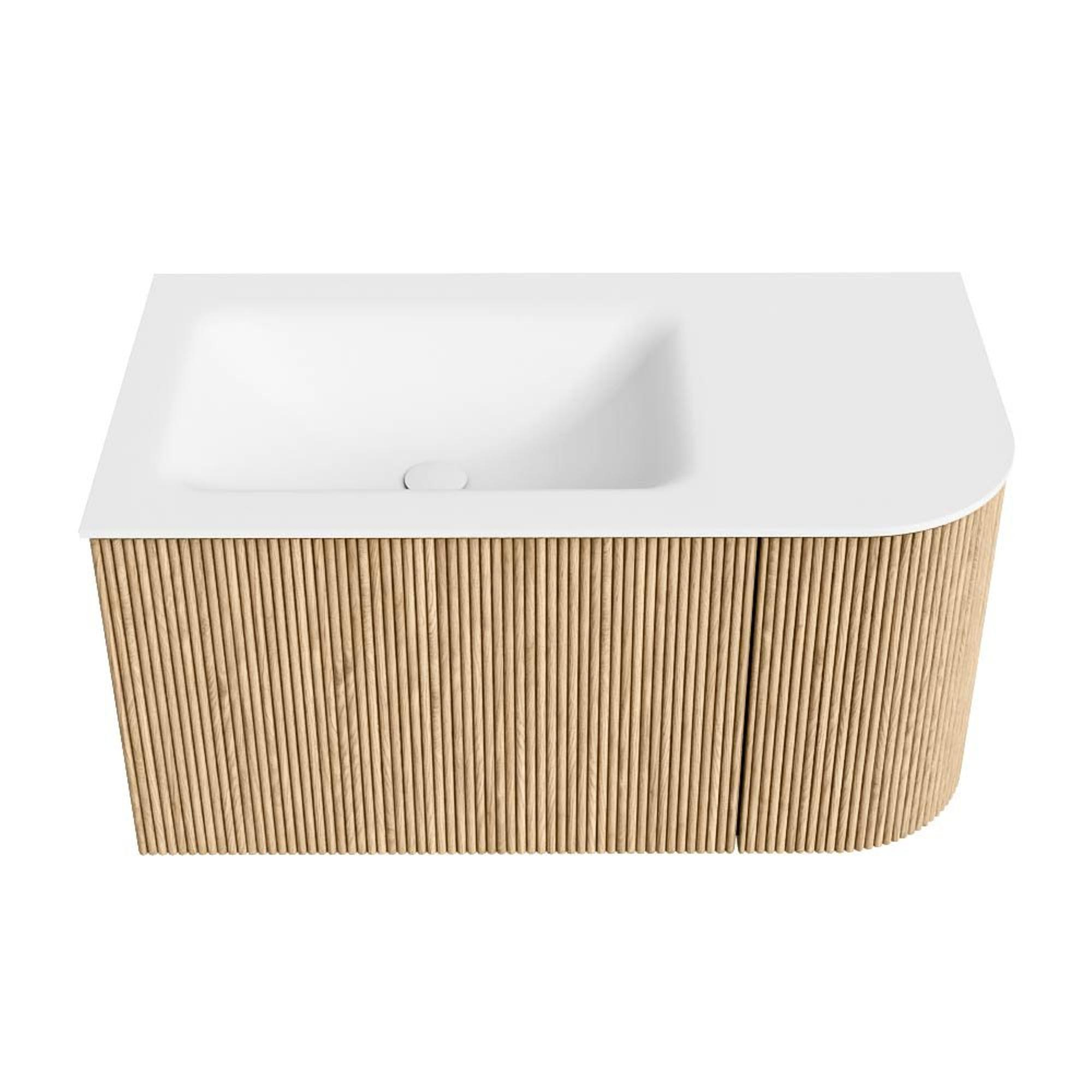 MONDIAZ KURVE 85cm badmeubel met module 25 R kleur Oak met 1 lade en 1 deur. Wastafel CLOUD links zonder kraangat Talc.