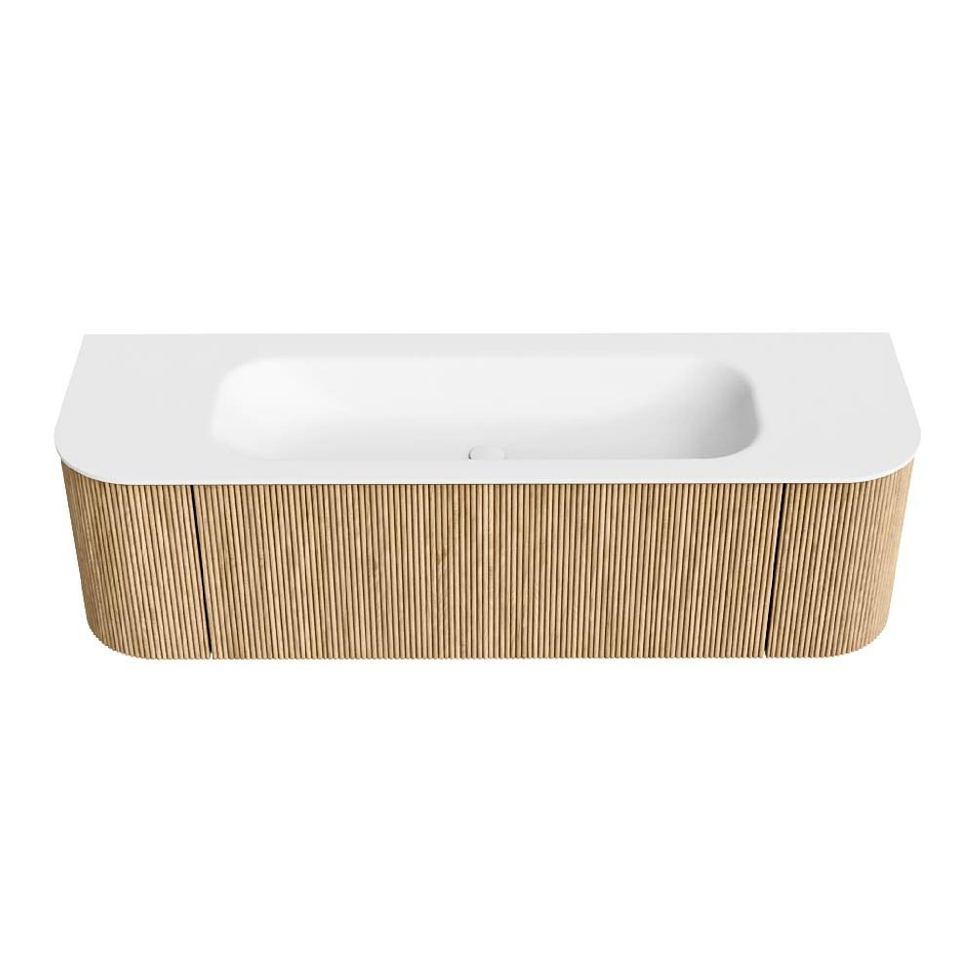 MONDIAZ KURVE 150cm badmeubel met module 25 Len R kleur Oak met 1 lade en 2 deuren. Wastafel BIG MEDIUM midden zonder kraangat Talc.