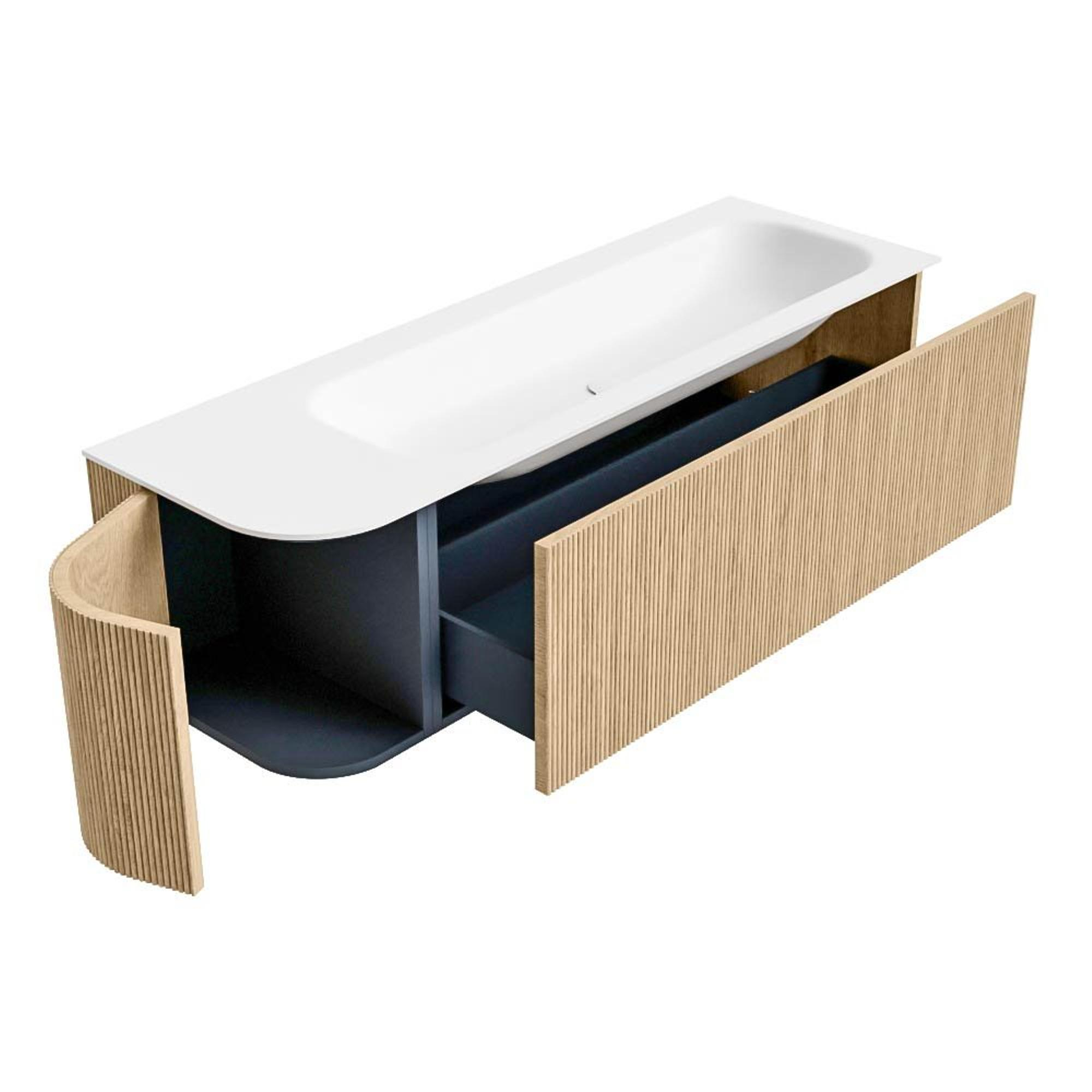 Het ultieme badmeubel dat je badkamer transformeert tot een oase van verfijning. Met zijn halfronde, verticale stroken van massief eiken, verkrijgbaar in de kleuren Oak en Walnut, straalt KURVE vakmanschap uit in elk detail. De zachte rondingen en slim ontworpen deurtjes, elk 40cm hoog, nodigen uit tot gebruik, terwijl de ruimte binnenin optimaal benut wordt dankzij de royale lade van dezelfde hoogte.