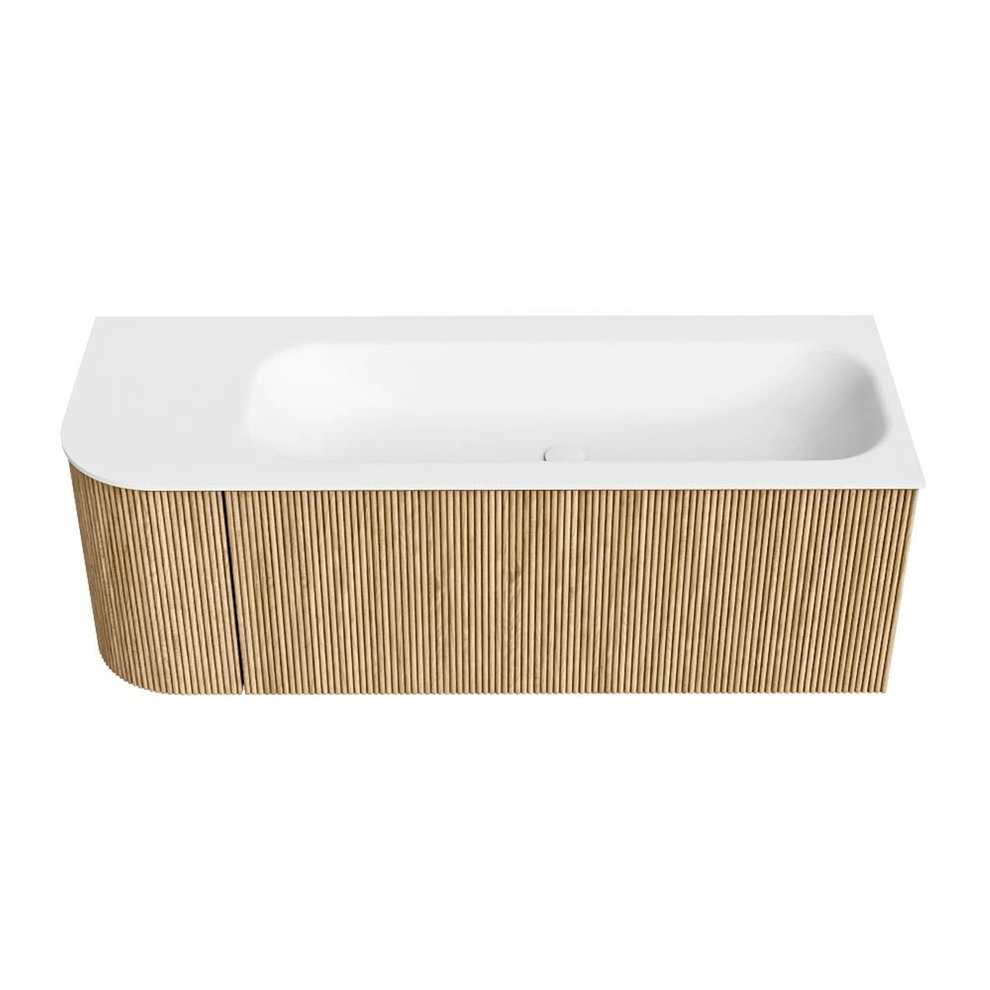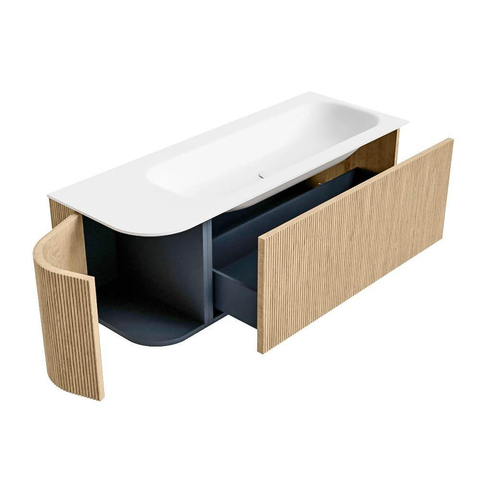 Het ultieme badmeubel dat je badkamer transformeert tot een oase van verfijning. Met zijn halfronde, verticale stroken van massief eiken, verkrijgbaar in de kleuren Oak en Walnut, straalt KURVE vakmanschap uit in elk detail. De zachte rondingen en slim ontworpen deurtjes, elk 40cm hoog, nodigen uit tot gebruik, terwijl de ruimte binnenin optimaal benut wordt dankzij de royale lade van dezelfde hoogte.