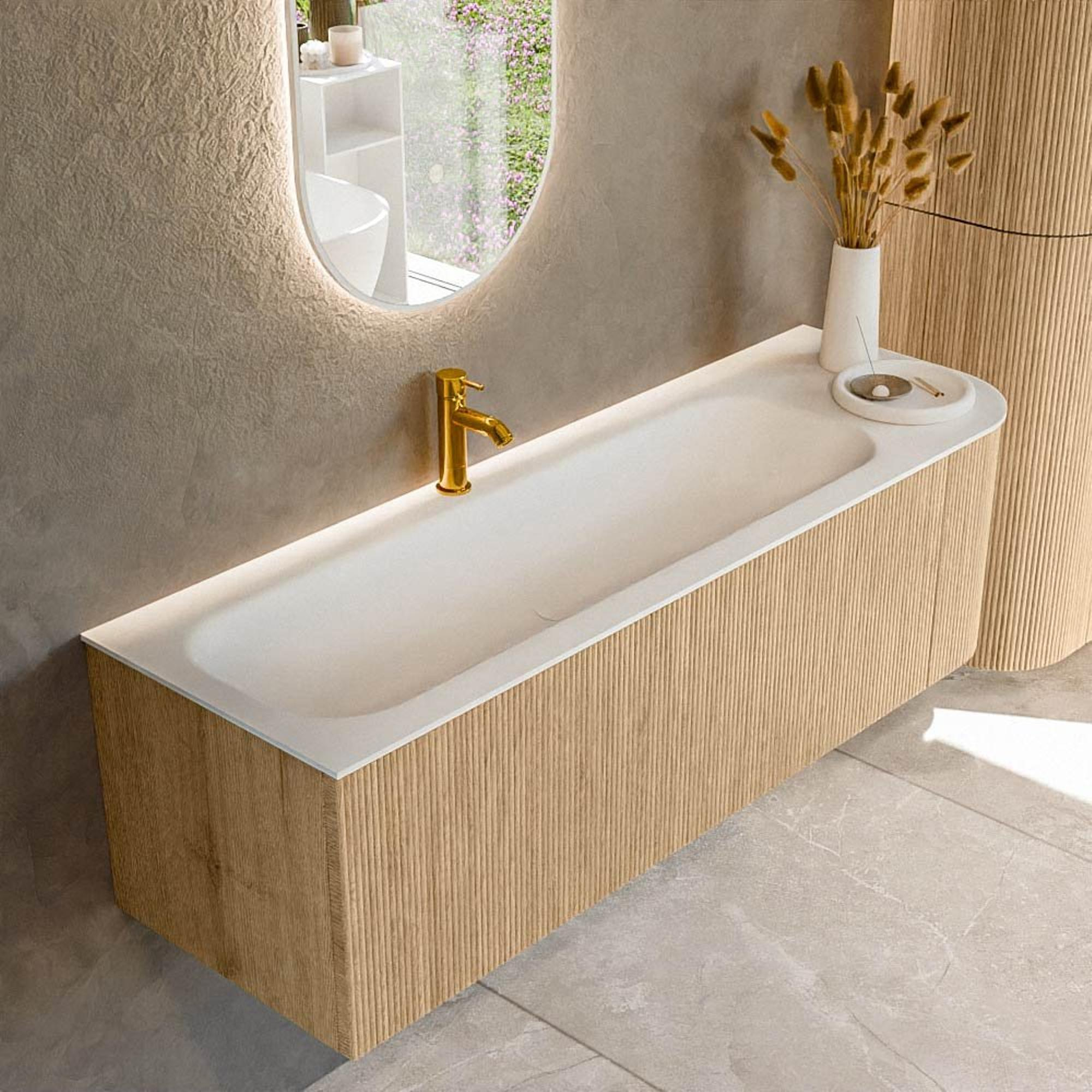 Het ultieme badmeubel dat je badkamer transformeert tot een oase van verfijning. Met zijn halfronde, verticale stroken van massief eiken, verkrijgbaar in de kleuren Oak en Walnut, straalt KURVE vakmanschap uit in elk detail. De zachte rondingen en slim ontworpen deurtjes, elk 40cm hoog, nodigen uit tot gebruik, terwijl de ruimte binnenin optimaal benut wordt dankzij de royale lade van dezelfde hoogte.
