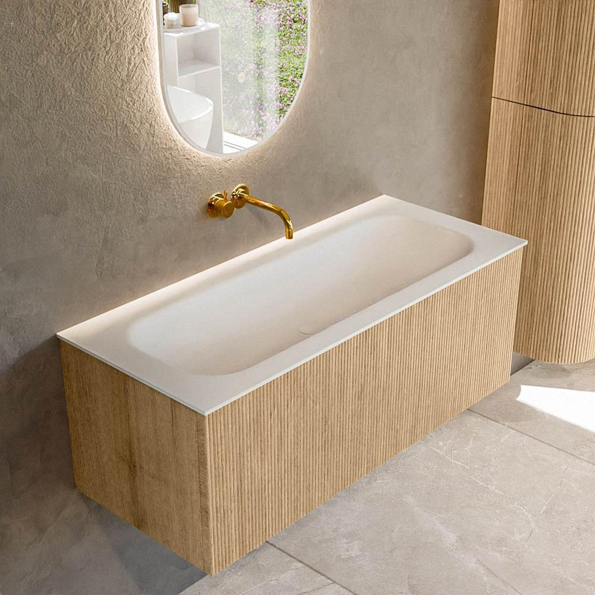 MONDIAZ KURVE 110cm badmeubel kleur Oak met 1 lade. Wastafel BIG MEDIUM midden zonder kraangat Talc.