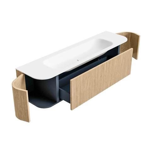 Het ultieme badmeubel dat je badkamer transformeert tot een oase van verfijning. Met zijn halfronde, verticale stroken van massief eiken, verkrijgbaar in de kleuren Oak en Walnut, straalt KURVE vakmanschap uit in elk detail. De zachte rondingen en slim ontworpen deurtjes, elk 40cm hoog, nodigen uit tot gebruik, terwijl de ruimte binnenin optimaal benut wordt dankzij de royale lade van dezelfde hoogte.