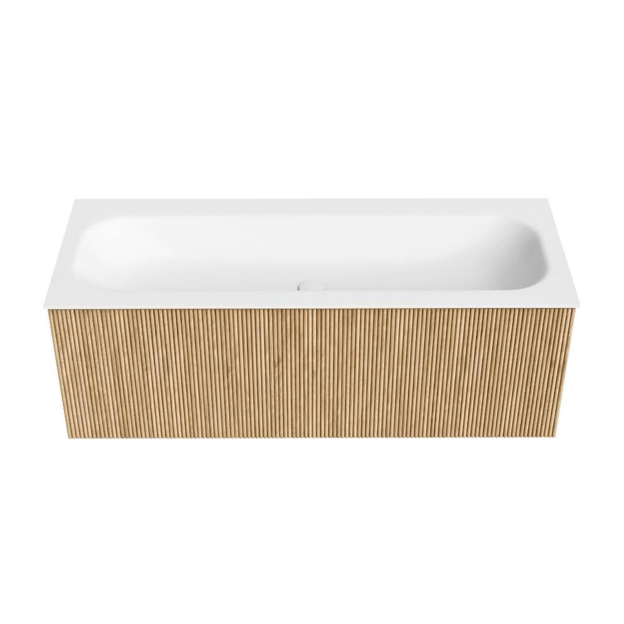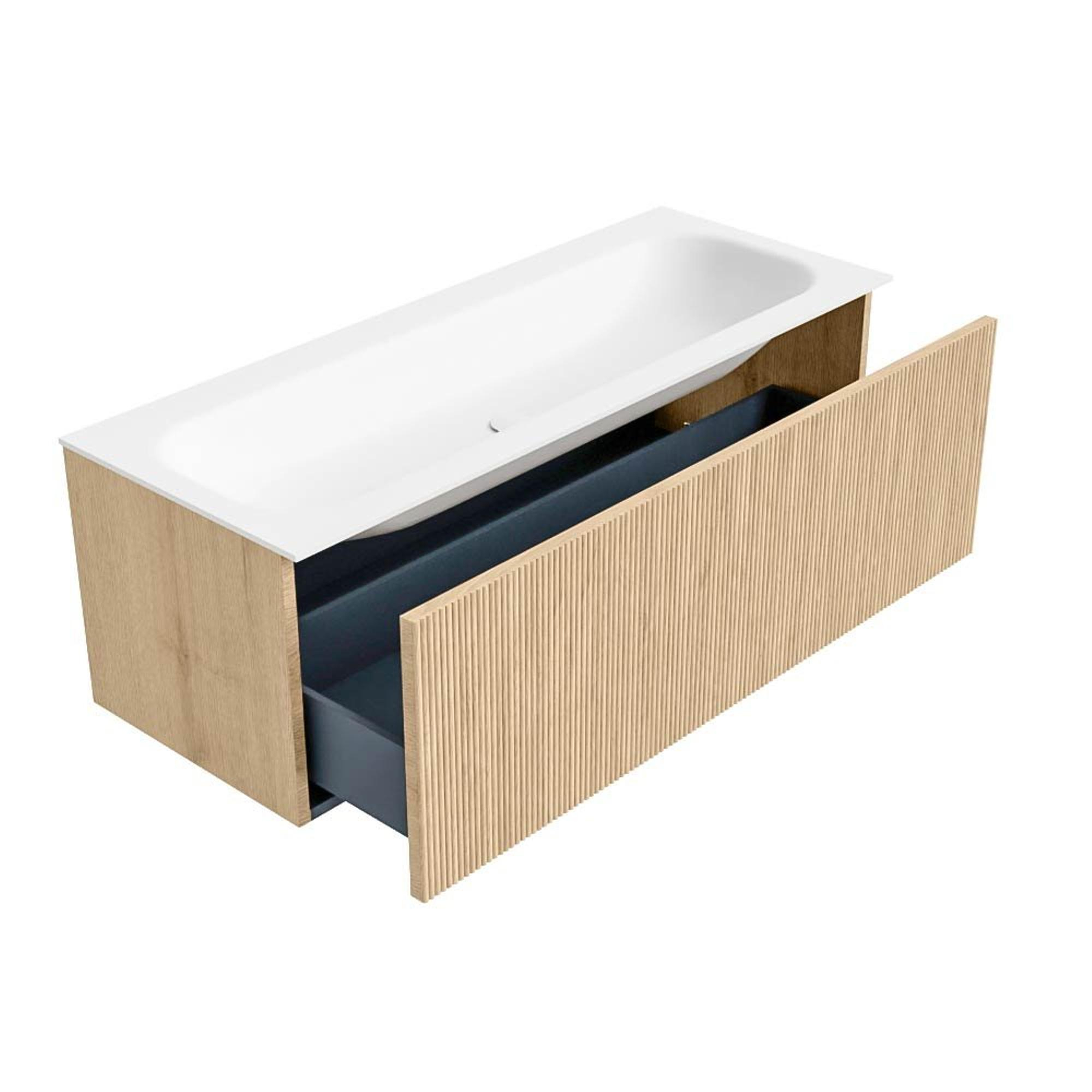 MONDIAZ KURVE 120cm badmeubel kleur Oak met 1 lade. Wastafel BIG LARGE midden zonder kraangat Talc.