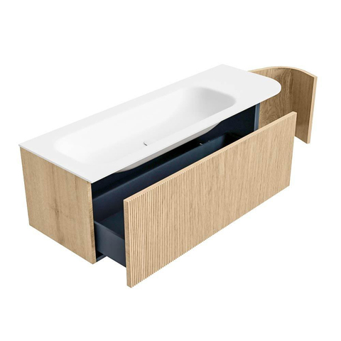 Het ultieme badmeubel dat je badkamer transformeert tot een oase van verfijning. Met zijn halfronde, verticale stroken van massief eiken, verkrijgbaar in de kleuren Oak en Walnut, straalt KURVE vakmanschap uit in elk detail. De zachte rondingen en slim ontworpen deurtjes, elk 40cm hoog, nodigen uit tot gebruik, terwijl de ruimte binnenin optimaal benut wordt dankzij de royale lade van dezelfde hoogte.