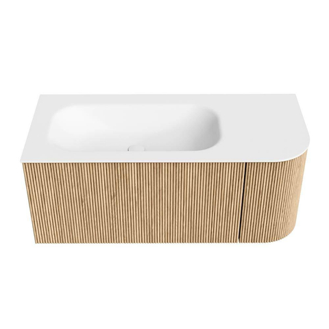 MONDIAZ KURVE 105cm badmeubel met module 25 R kleur Oak met 1 lade en 1 deur. Wastafel BIG SMALL links 1 kraangat Talc.