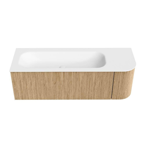 MONDIAZ KURVE 135cm badmeubel met module 25 R kleur Oak met 1 lade en 1 deur. Wastafel BIG MEDIUM links 1 kraangat Talc.