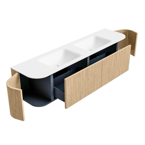 Het ultieme badmeubel dat je badkamer transformeert tot een oase van verfijning. Met zijn halfronde, verticale stroken van massief eiken, verkrijgbaar in de kleuren Oak en Walnut, straalt KURVE vakmanschap uit in elk detail. De zachte rondingen en slim ontworpen deurtjes, elk 40cm hoog, nodigen uit tot gebruik, terwijl de ruimte binnenin optimaal benut wordt dankzij de royale lade van dezelfde hoogte.
