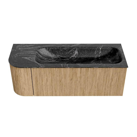 Het ultieme badmeubel dat je badkamer transformeert tot een oase van verfijning. Met zijn halfronde, verticale stroken van massief eiken, verkrijgbaar in de kleuren Oak en Walnut, straalt KURVE vakmanschap uit in elk detail. De zachte rondingen en slim ontworpen deurtjes, elk 40cm hoog, nodigen uit tot gebruik, terwijl de ruimte binnenin optimaal benut wordt dankzij de royale lade van dezelfde hoogte.