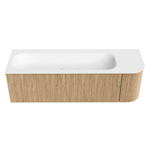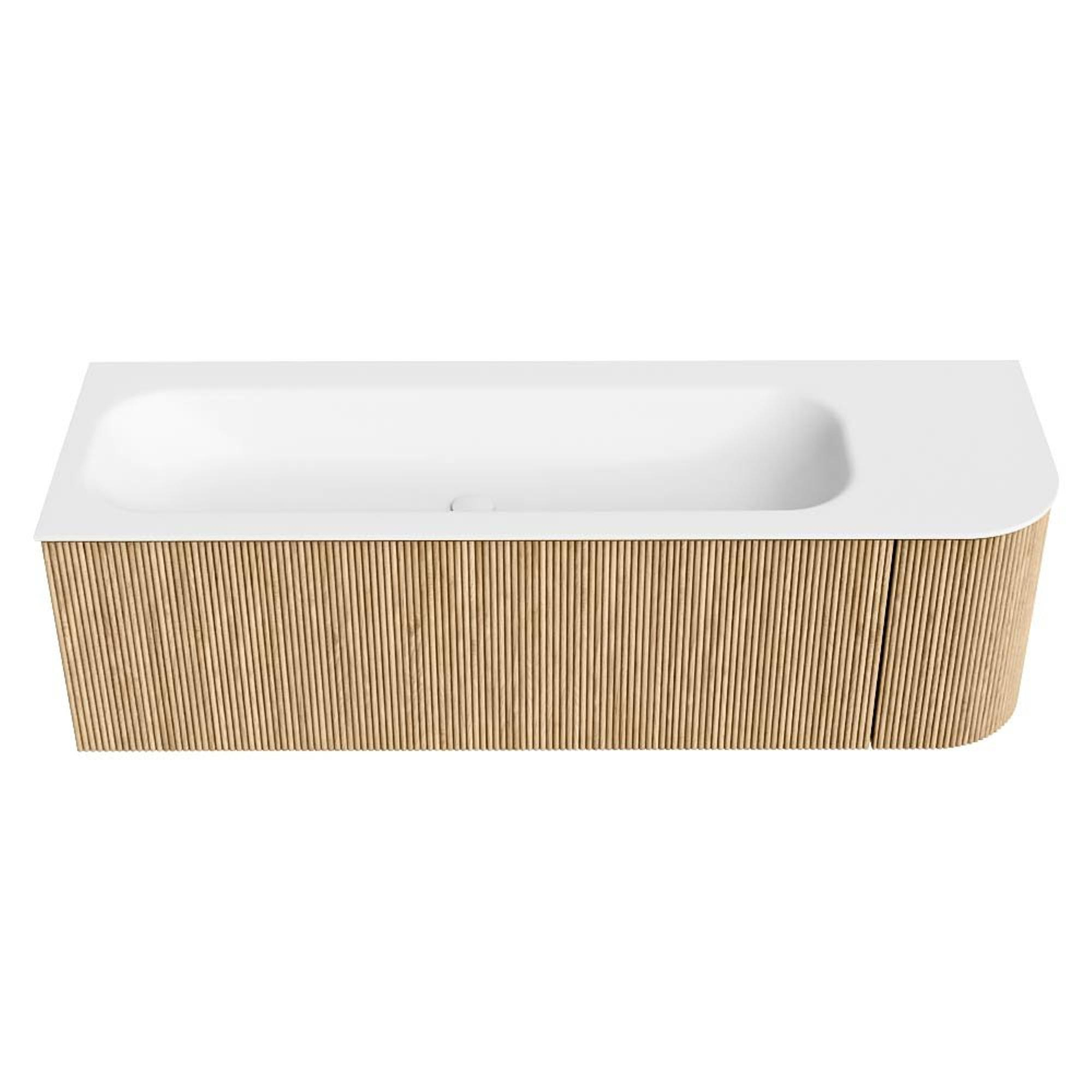 MONDIAZ KURVE 145cm badmeubel met module 25 R kleur Oak met 1 lade en 1 deur. Wastafel BIG LARGE links zonder kraangat Talc.